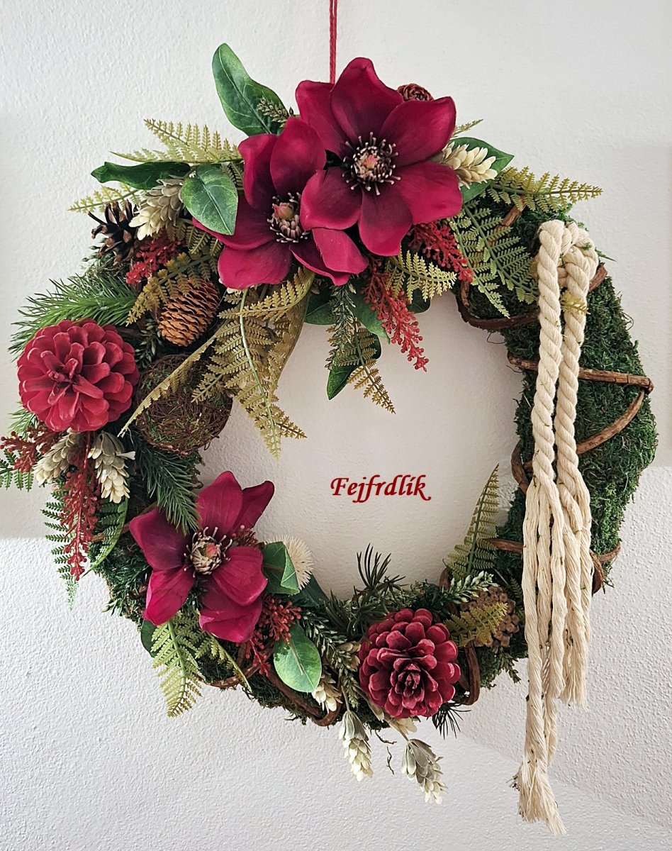 Trvanlivý mechový věnec s umělými magnoliemi , kapradím , vřesem, jehličím a šiškami.