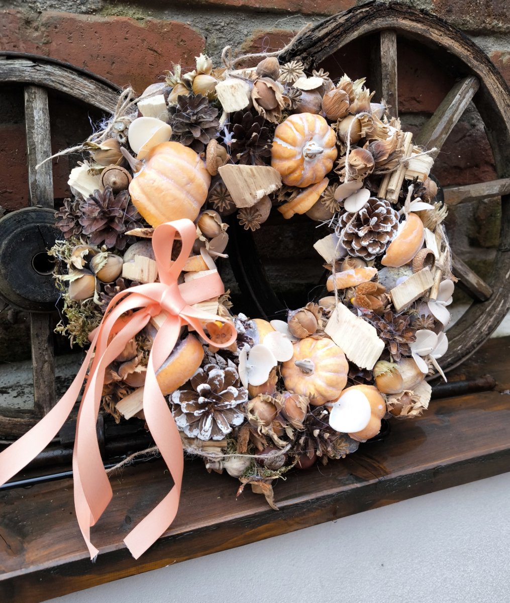 Věneček v podzimních tónech o průměru cca 30 cm, vzadu háček na zavěšení.