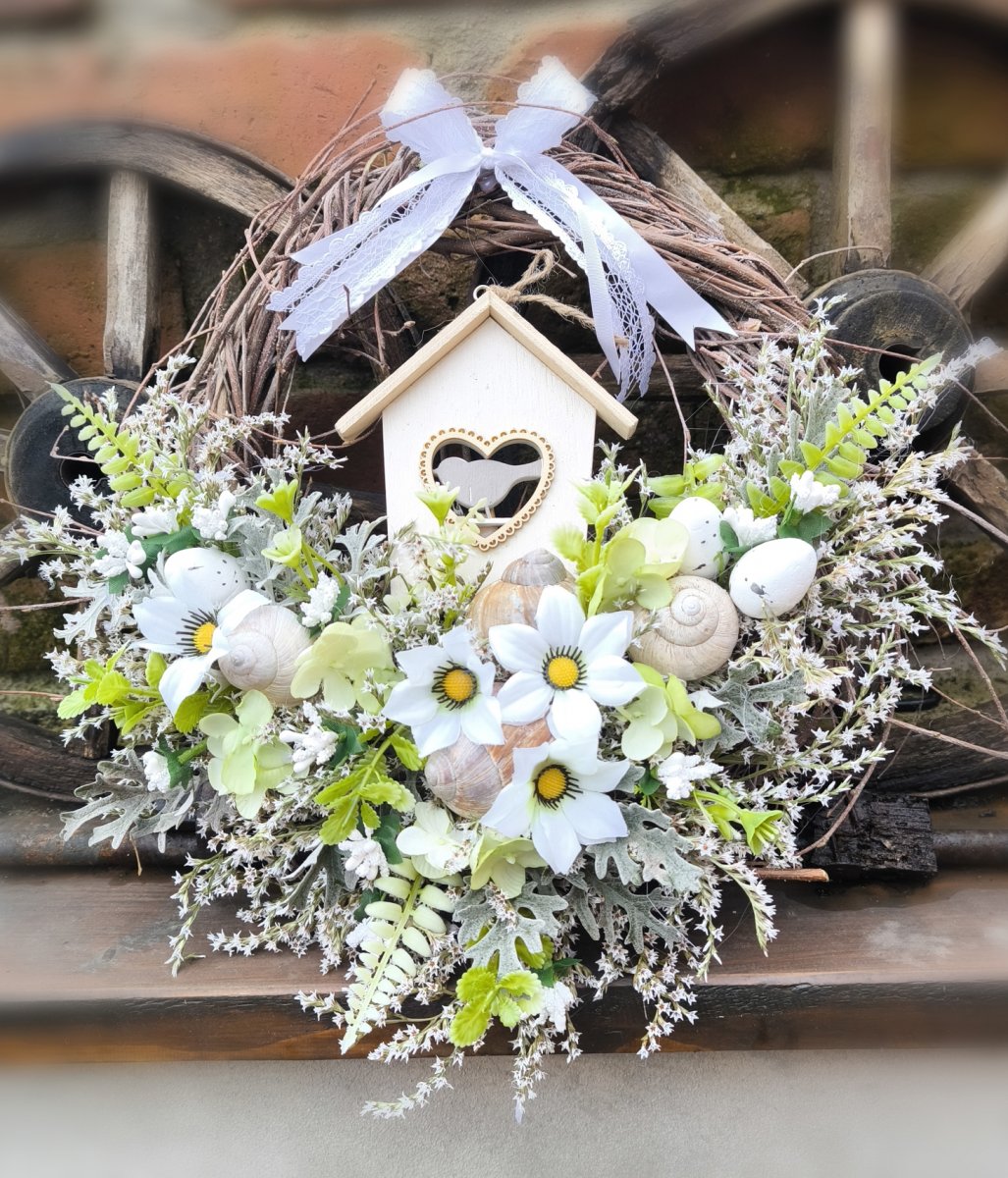 Jarní věneček s dřevěným domečkem, průměr cca 30 cm, vzadu háček na zavěšení.