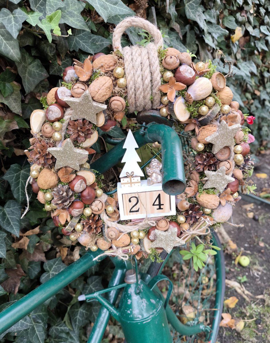 Trvanlivý věneček s adventním kalendářem - dřevěná dekorace - dvě otáčecí kostičky, průměr věnečku cca 30 cm,