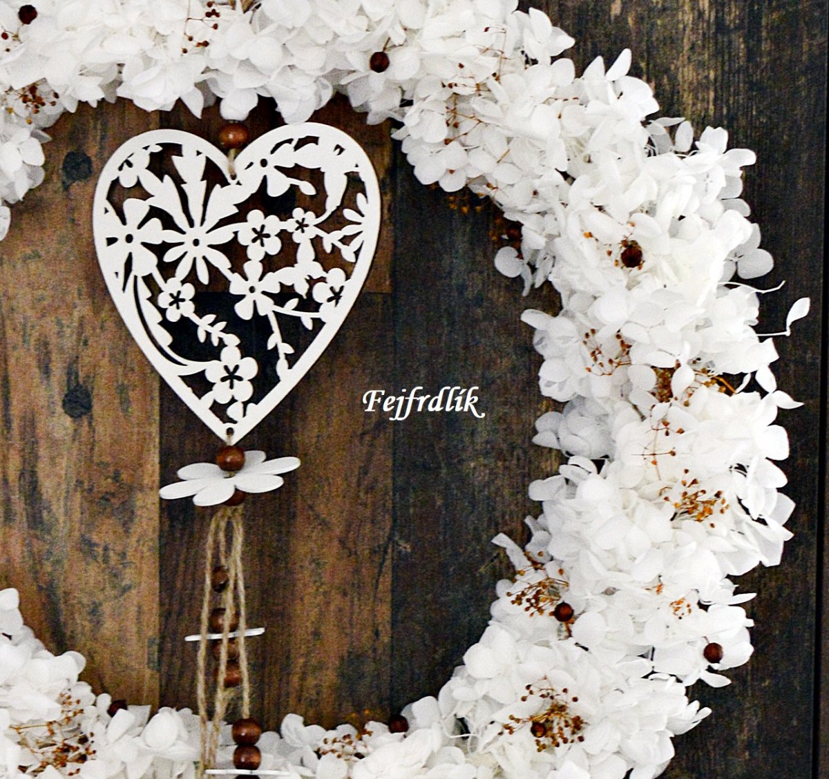 Věneček na kovovém kruhu s očkem na zavěšení se sušenou , stabilizovanou bělenou hortenzií , lnem a s kovovou ozdobou s dřevěnými korálky.