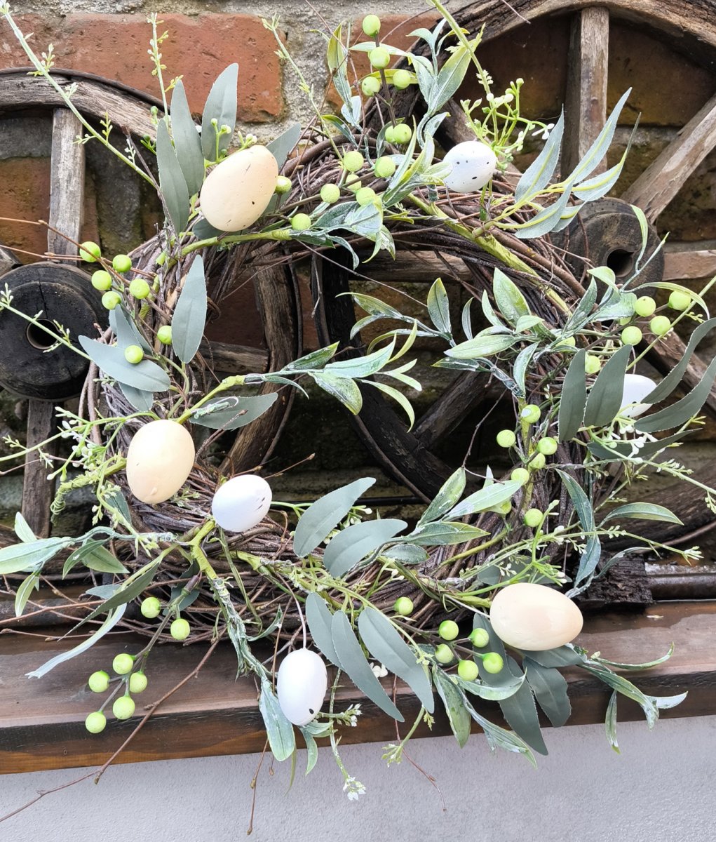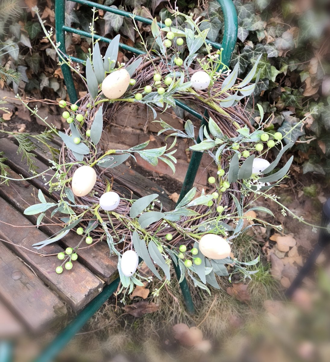 Věneček, který lze umístit i ven, nelepený, spojený drátky, proutěný základ, umělé květiny, průměr cca 30 cm. Vzadu háček na zavěšení.