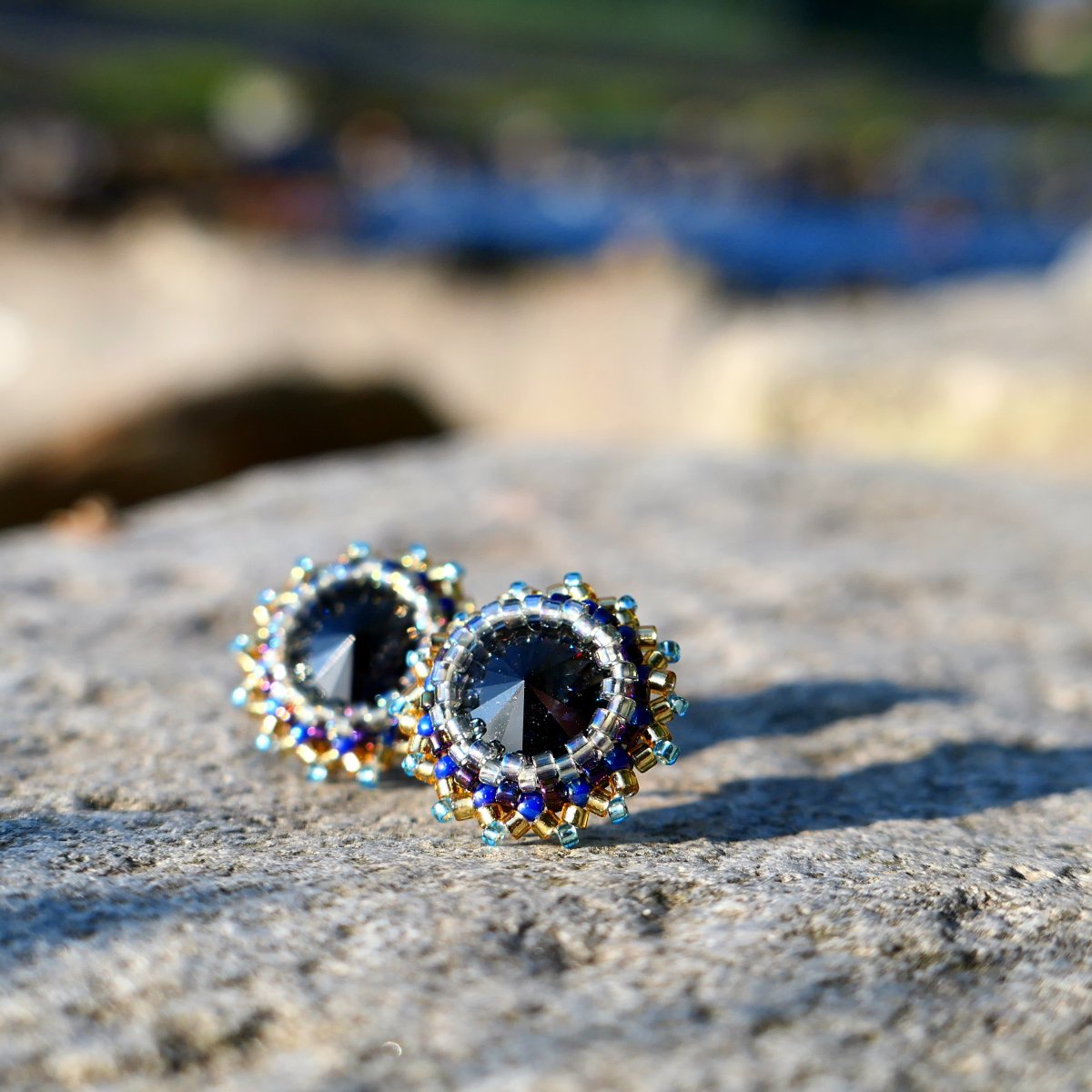 Šité náušnice s kameny Swarovski, obšité japonským rokajlem TOHO, Delicia a Miyuky v barvách šedá s listrem, kovově ametystová, modrofialová, zlatá a světle modrá. Barva rivoli je šedomodrá.