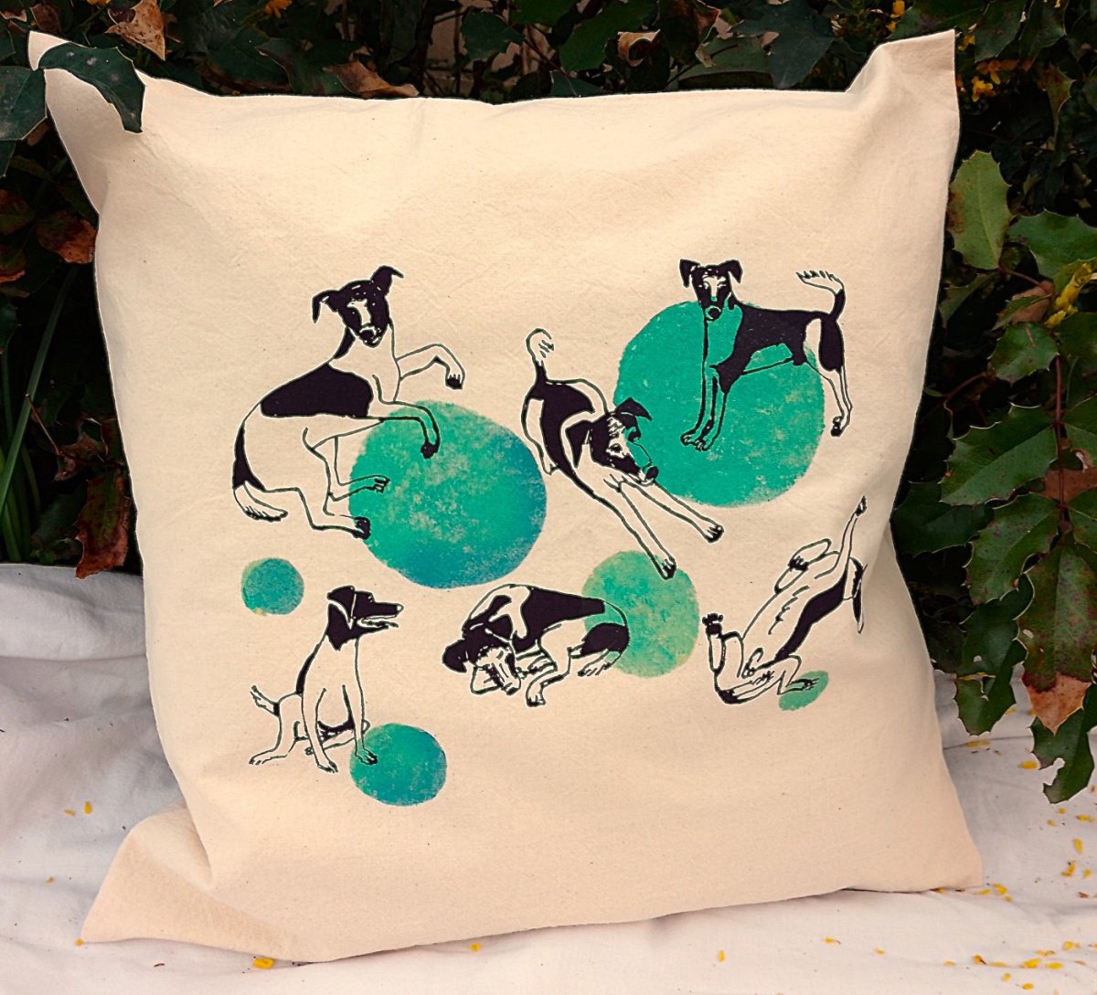 Dekorační polštářek s motivem pejsků, má přírodní barvu a je ušitý z lněného plátna