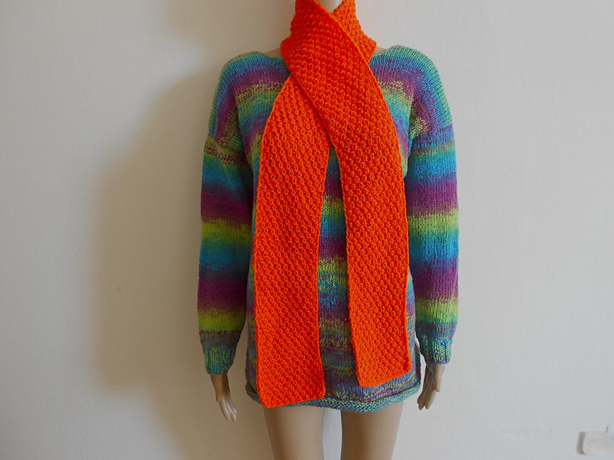 Ručně pletená, pružná, střední šála oranžová. Velikost: délka 154cm, šířka 11cm. Doporučuji ruční praní nebo v pračce program na vlnu, sušit volně položené.