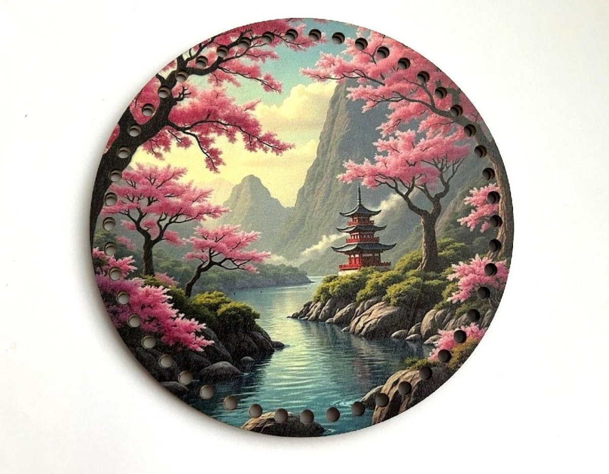 Dřevěný kruh s motivy krajiny a velkými otvory se hodí na výrobu bytových dekorací. Víko je vhodné pro háčkované košíky ze špagetové příze.Kruh má 48 otvorů.