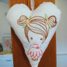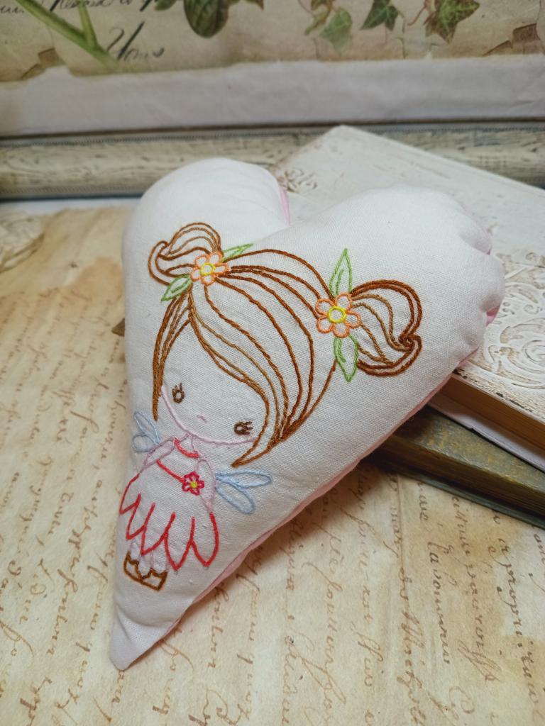 Ručně vyšívané srdce ze 100% bavlny s motivem holčičky víly s kytičkami ve vlasech a na šatičkách. Zadní díl je ušitý z růžové látky s hvězdičkami. Srdíčko je plněné dutým vláknem a sáčkem s levandulí lékařské kvality. Horní část srdce je opatřená krajkou k zavěšení, například na postýlku, okenní kličku, trám apod..