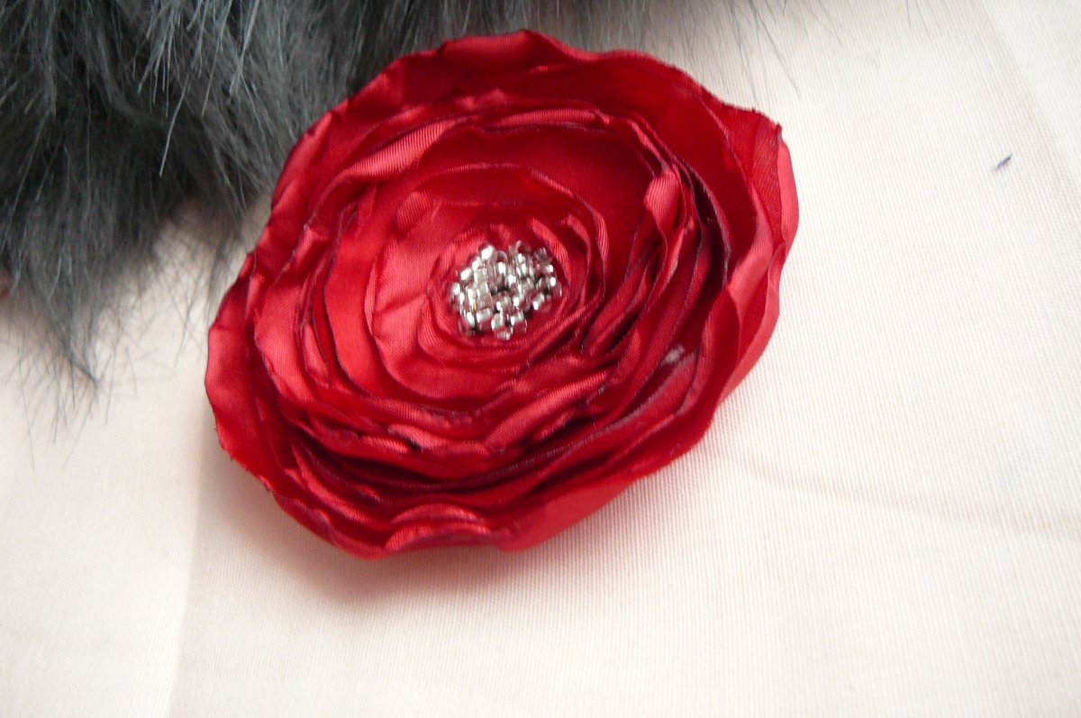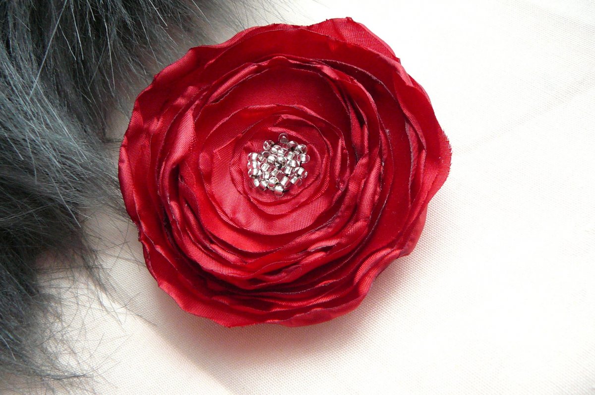 Lehká brož, ušitá z různých látek červeno-vínové barvy, velikosti 8,5 cm. Zapínání na spínací špendlík.