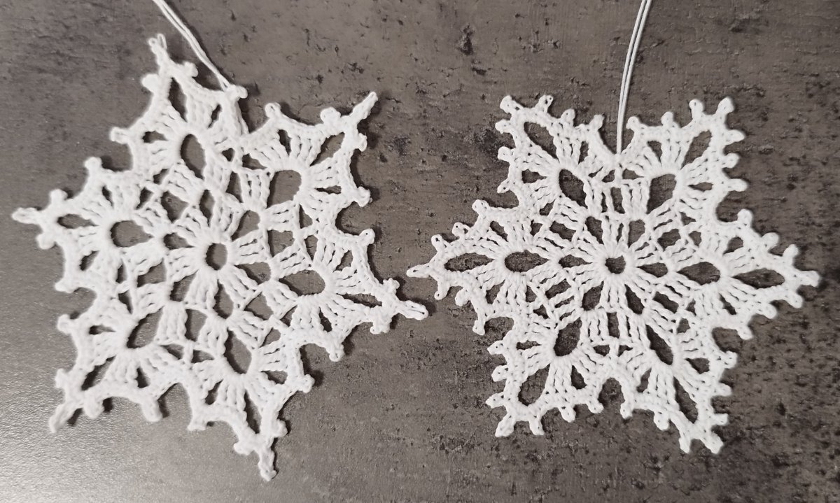 Háčkovaná vločka bílé barvy, natuženo cukrem, pevný tvar, nezažloutává.