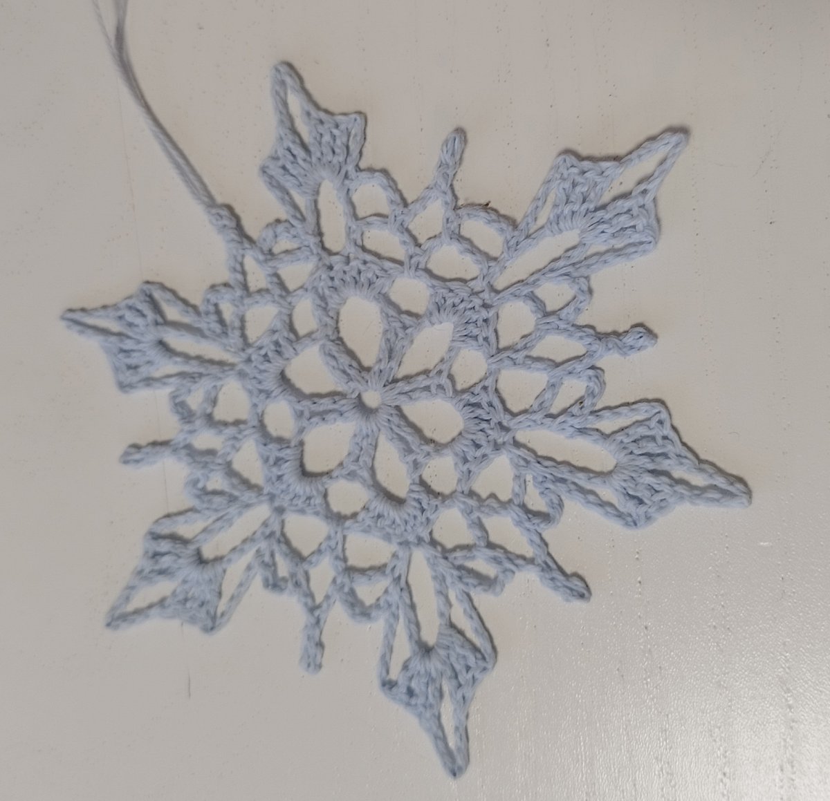 Háčkovaná vločka světlounce modré barvy, natuženo cukrem, pevný tvar, nezažloutává.