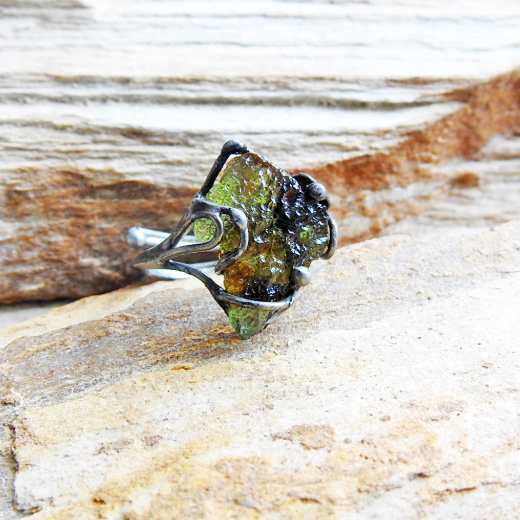 Cínovaný prsten s vltavínem.