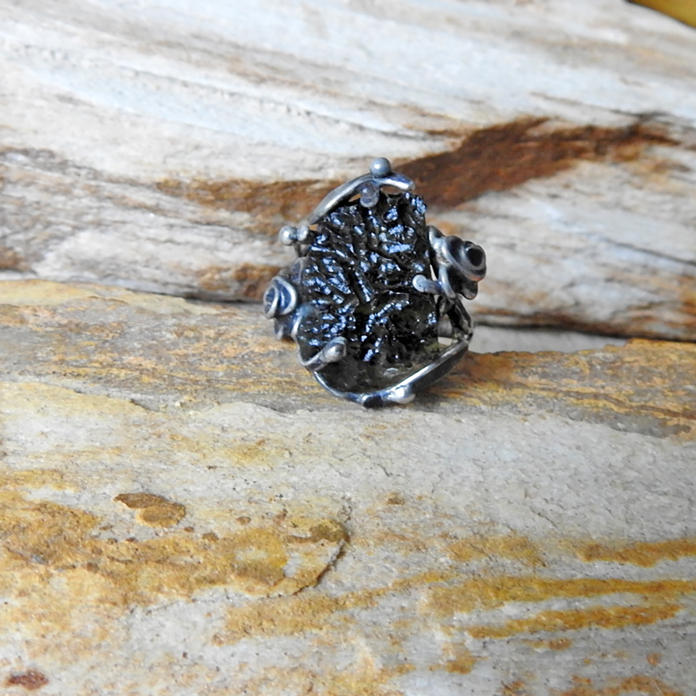 Cínovaný prsten s vltavínem.