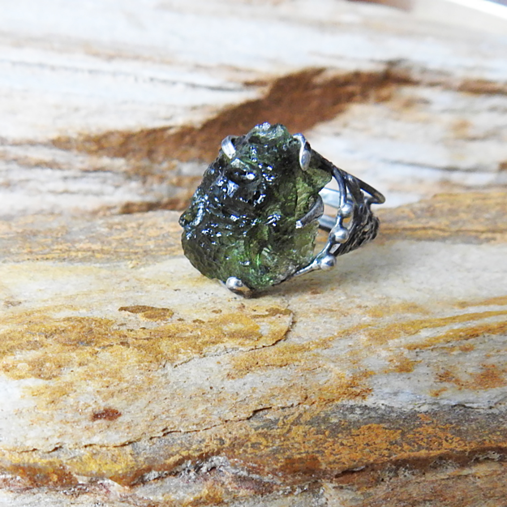 Cínovaný prsten s vltavínem.