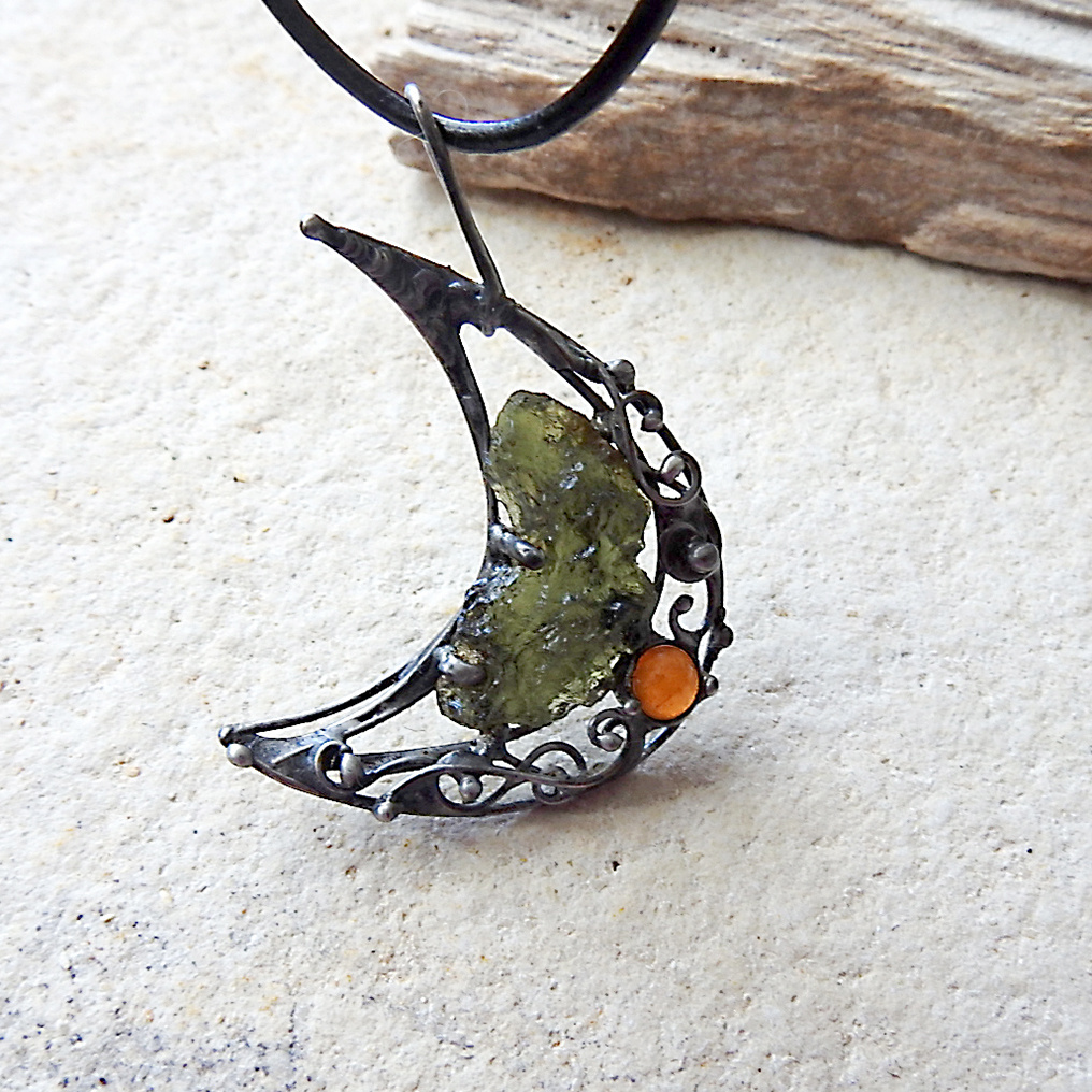 Cínovaný náhrdelník s vltavínem a spessartinem.
