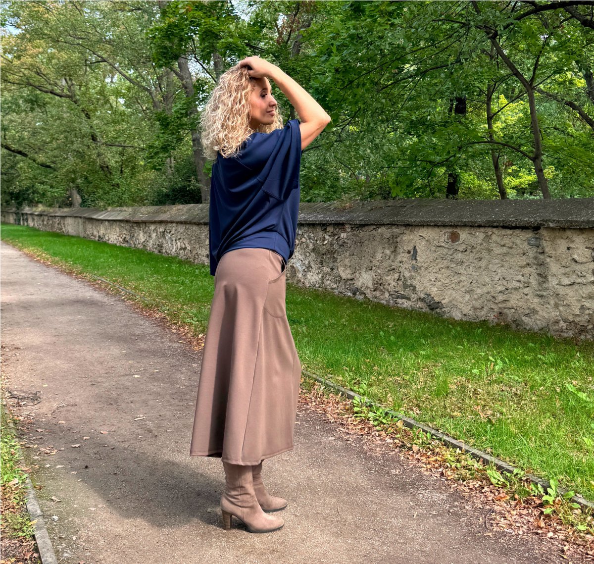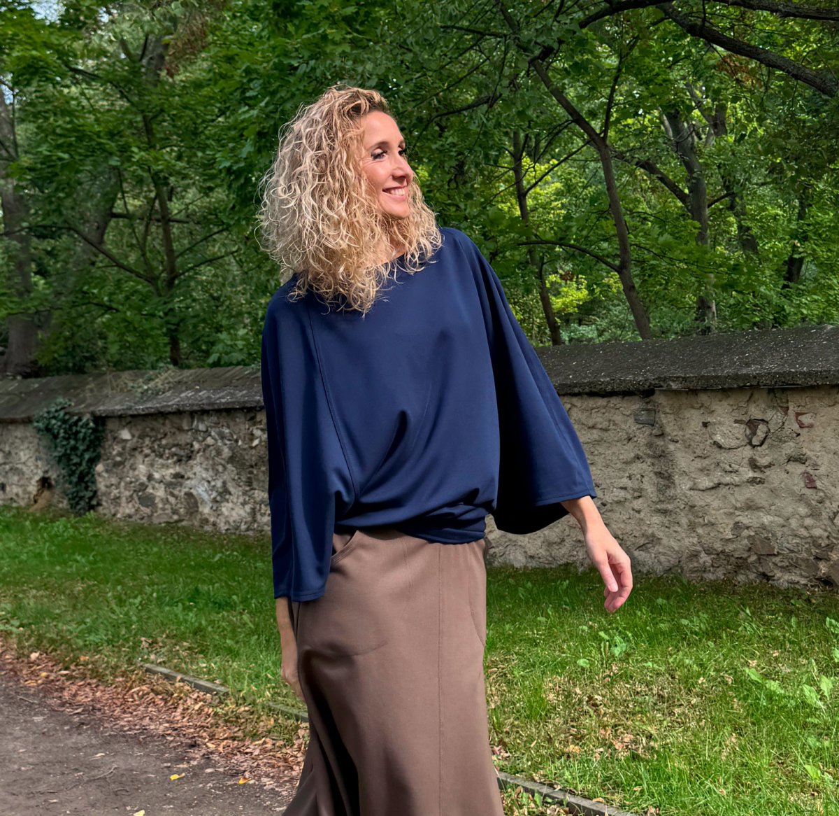 Volná tunika s netopýřími rukávy a volným výstřihem je ušitá ze směsového středně silného úpletu (měkký, pružný).