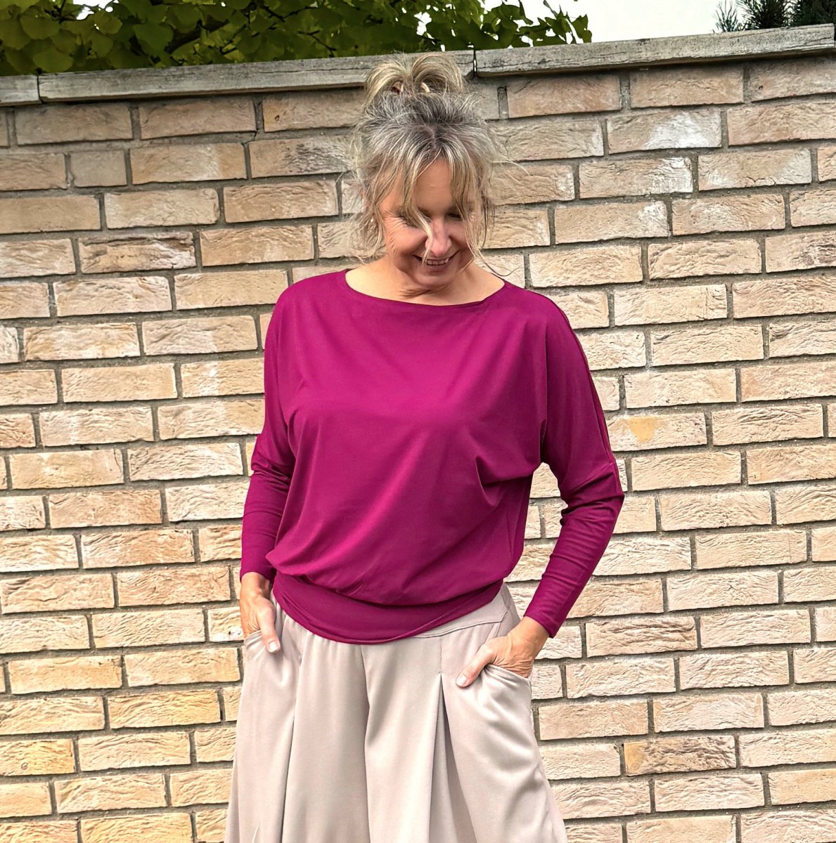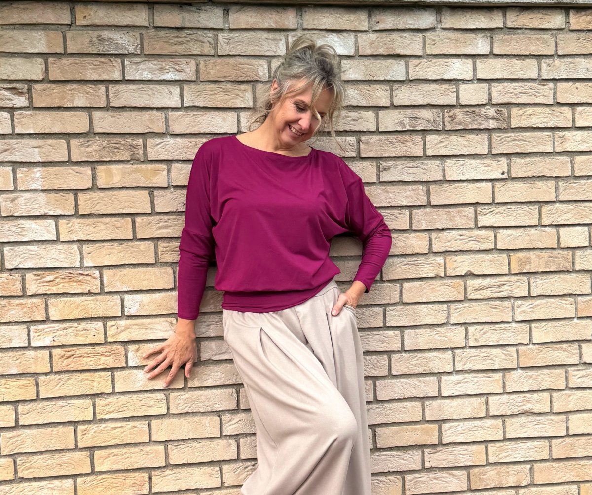 Tričko volného netopýřího střihu, které má spodní díl stažený do širokého pásku je ušité z úpletu viskóza/elastan. Rukávy jsou dlouhé.