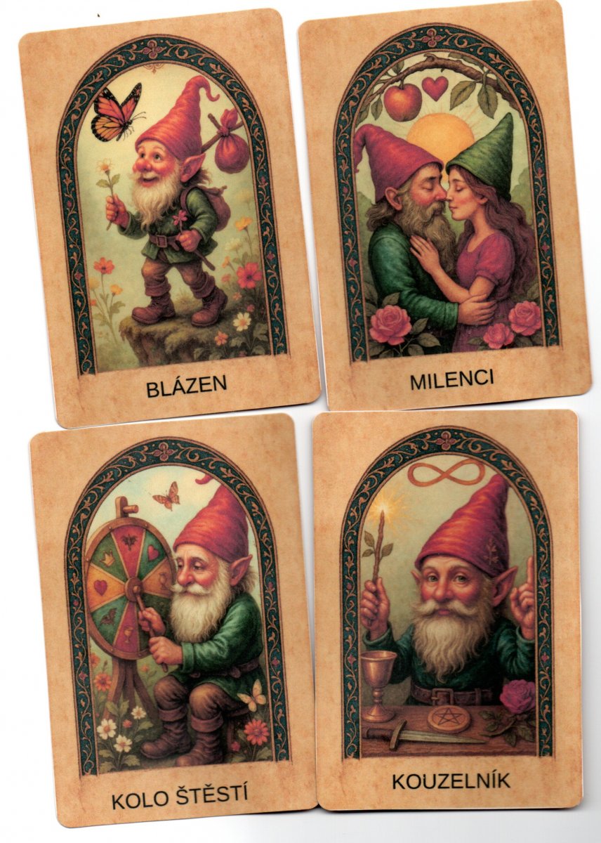 Vykládací karty VELKÁ ARKÁNA 22 ks, pohádkově laděné s trpaslíky ,velké karty vel: 8x12cm . pc tvorba na papíře 250g přelakováno proti oděru a pro pevnost karet ruční výroba