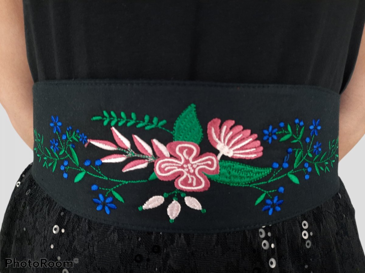 Opasok je strojovo vyšívaný. Základom je čierny bavlnený podklad na ktorom sú vyšívané farebbné kvetované ornamenty. Opasok je z bavlnenej látky a vo vnútri je kvalitne vystužený, aby dobre držal tvar. Je šitý v strihu, ktorý je v strede širší a postupne sa zužuje. Údržba - najlepšie prať pri 30 stupňoch C, jemne vyžmýkať a nechať voľne osušiť. Prežehliť z rubovej strany, líc cez bavlnené plátno.