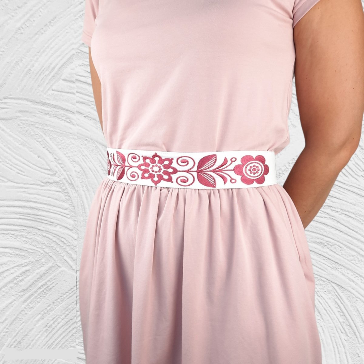 Opasok je strojovo vyšívaný. Základom je biely bavlnený podklad na ktorom sú vyšité kvetované ornamenty v odtieni staroružovej. Opasok je z bavlnenej látky a vo vnútri je kvalitne vystužený, aby dobre držal tvar. Šírka opasku je rovnaká v celej jeho dľžke. V zadu sa viaže pomocou stuhy v bielej farbe. Údržba - najlepšie prať pri 30 stupňoch C, jemne vyžmýkať a nechať voľne osušiť. Prežehliť z rubovej strany, líc cez bavlnené plátno.