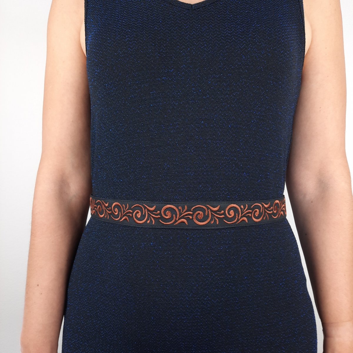 Opasok je strojovo vyšívaný. Základom je čierny bavlnený podklad na ktorom sú vyšité jemné ornamenty. Opasok je z bavlnenej látky a vo vnútri je kvalitne vystužený, aby dobre držal tvar. Šírka opasku je 3,5 cm a je rovnaká v celej jeho dľžke. V zadu sa viaže pomocou stuhy v čiernej farbe. Údržba - najlepšie prať pri 30 stupňoch C, jemne vyžmýkať a nechať voľne osušiť. Prežehliť z rubovej strany, líc cez bavlnené plátno.