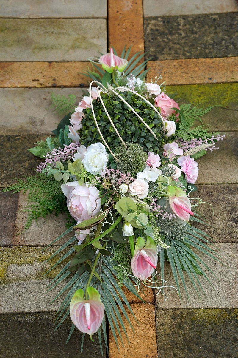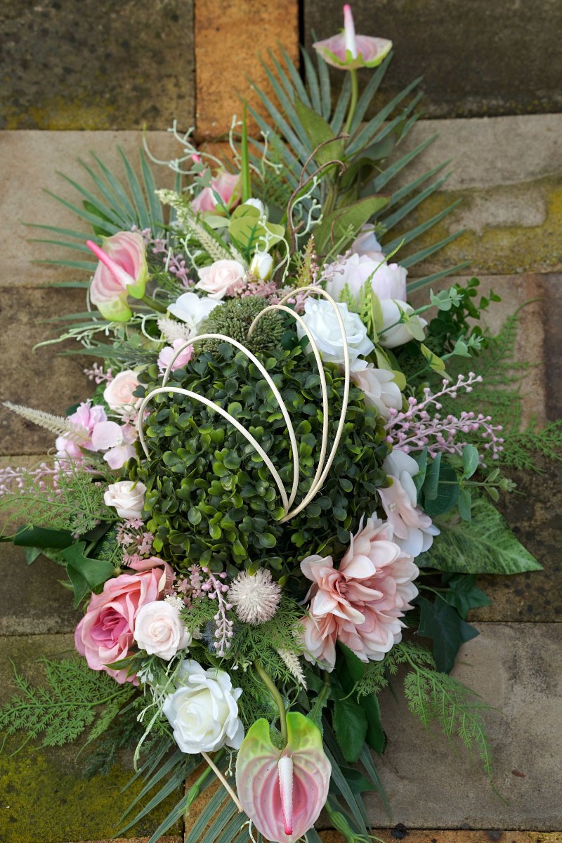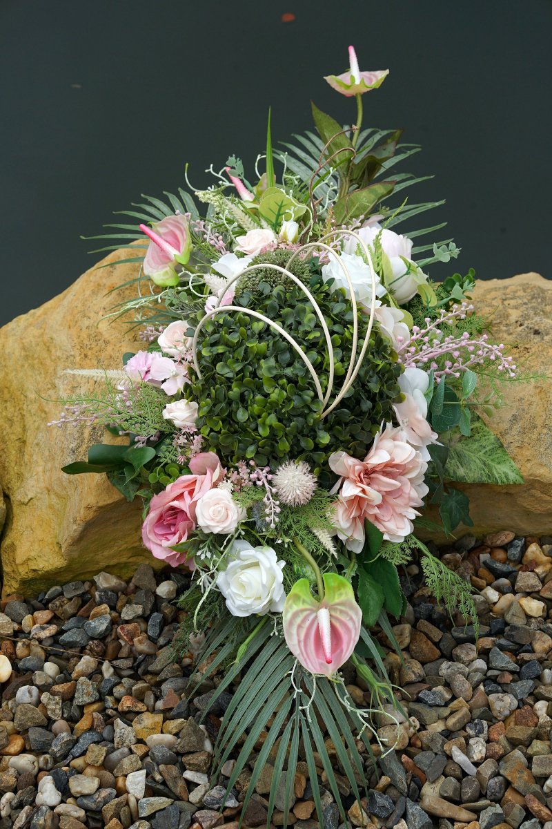 Smuteční dekorace k položení na hrob, rozměr 80x40x22cm. Dekorace je umístěna na kamenné podložce, aby odolala větru.