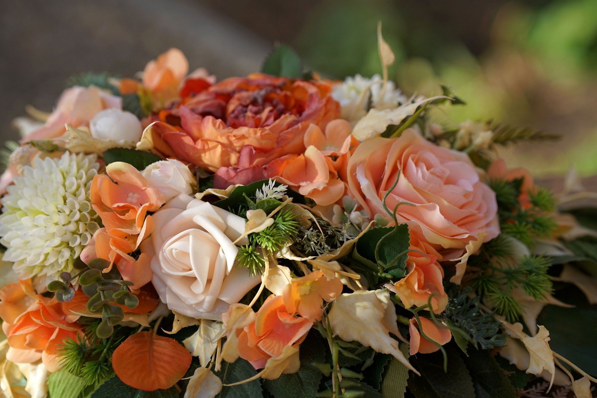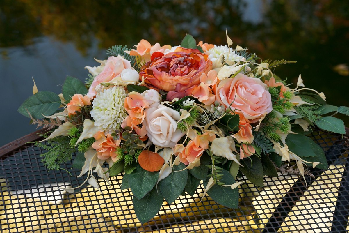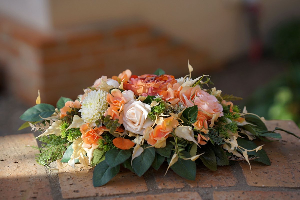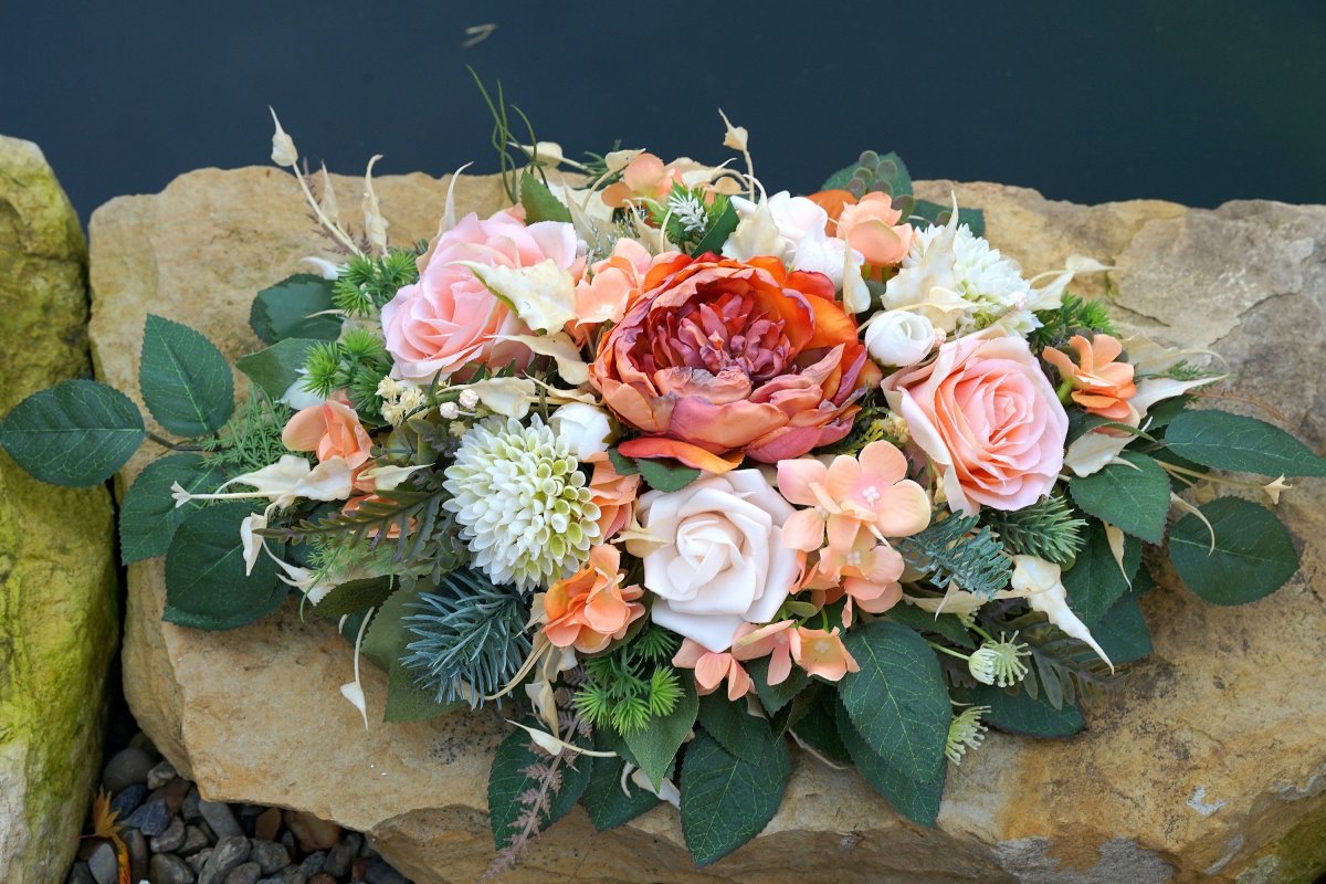 Kvěitnová dekorace na hrob v meruňkové a smetanové barvě. Rozměr dekorace je 53x30x14cm. Květiny jsou látkové a celá dekorace je umístěna na břidlicové podložce.