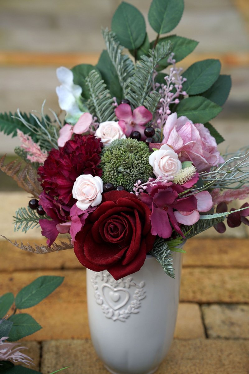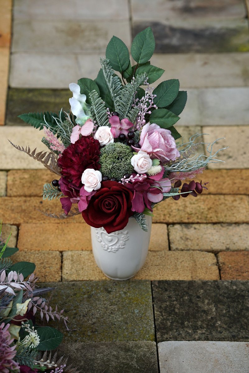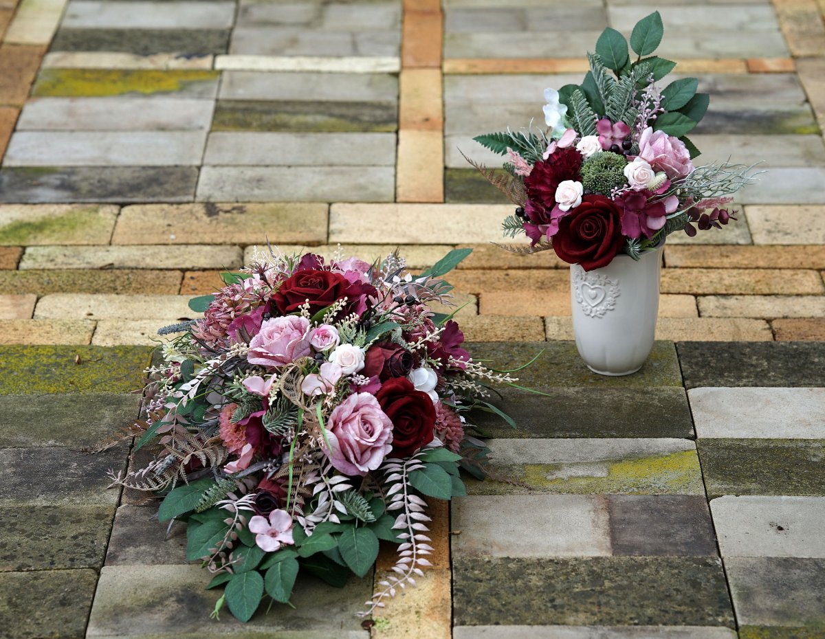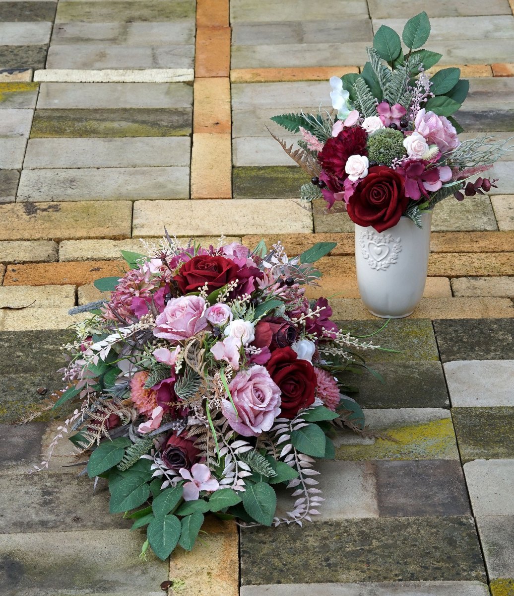 Velká vzpomínková dekorace v bordo a růžové barvě. Rozměr 80x40x20cm. Je připevněna na kamenné podložce, aby odolala větru.