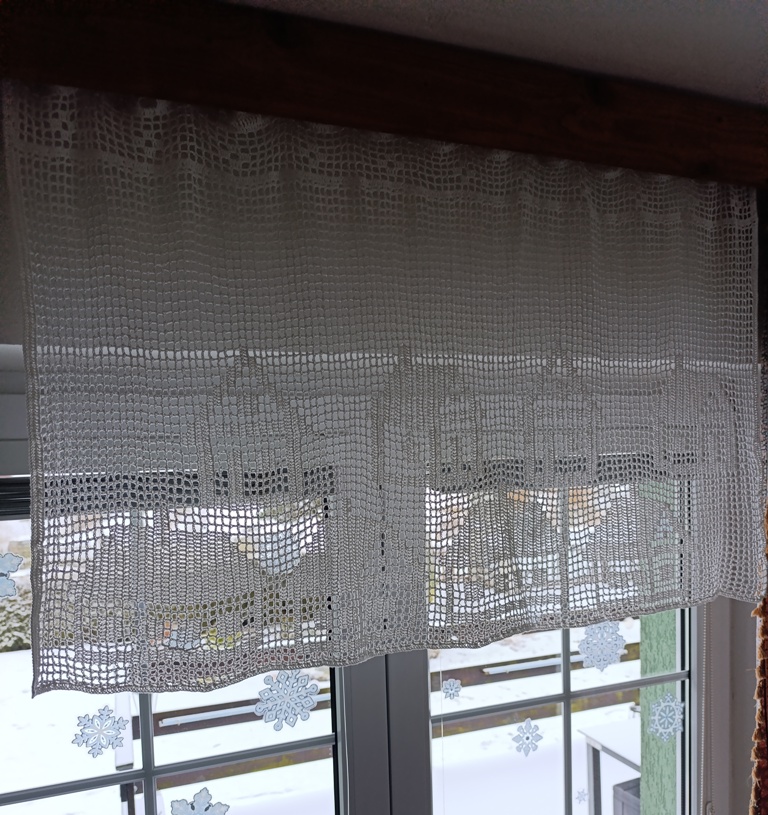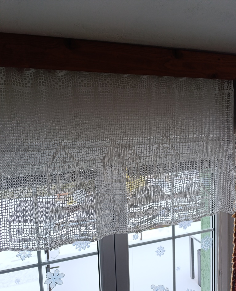 Háčkovaná záclonka z bavlněné příze. Pro pověšení můžete použít žabky nebo tyč. Záclona má v horním kraji otvory pro tyč.
