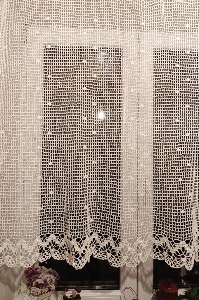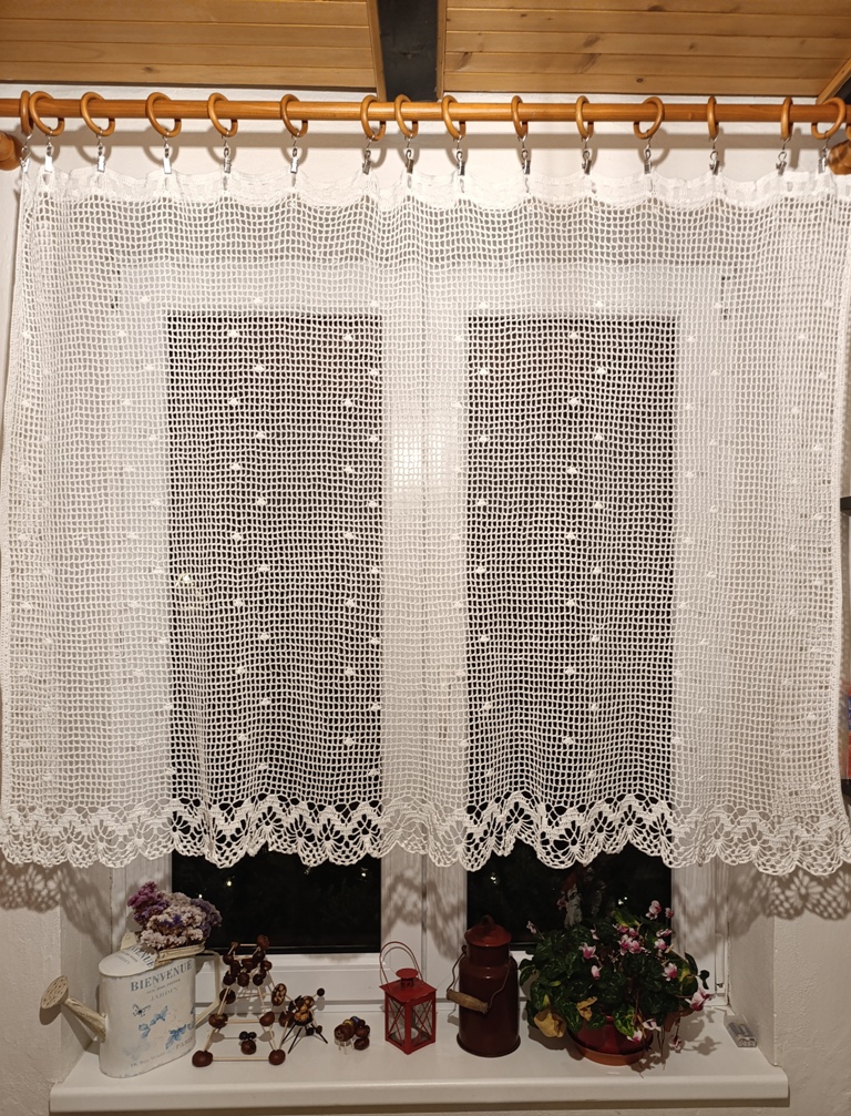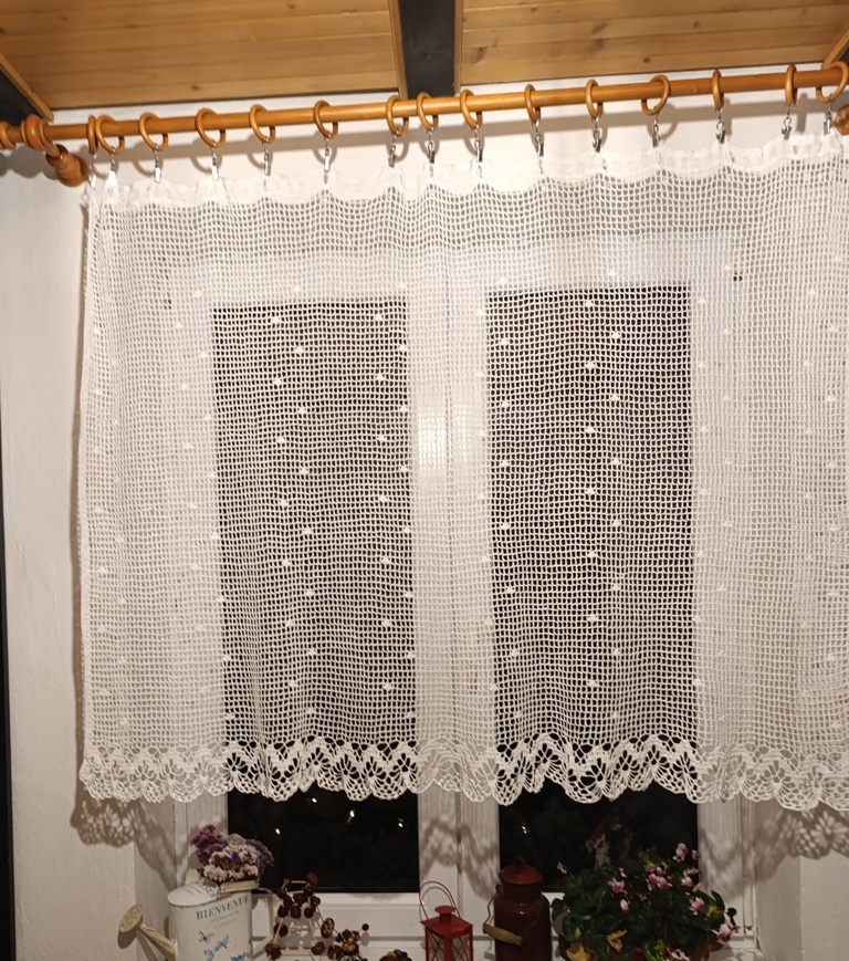 Velikost je cca v.100 x š.130 cm. Doporučuju prát v ruce, neždímat, sušit nejlépe ve vodorovné poloze a nedávat do sušičky. Pokud chcete přece jen prát v pračce, perte jako vlnu nebo jemné prádlo, sušte ve vodorovné poloze a nakonec můžete opatrně přežehlit aby se záclona srovnala a natáhla na původní rozměry. Pokud se budete o záclonu dobře starat, vydrží vám krásná hodně dlouho a vaše okno bude originál.