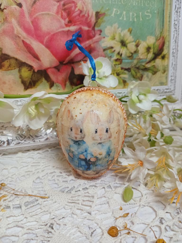 Velikonoční vajíčko s motivy zajíčků a květin. Celé je krakelované a patinované, lakované lesklým lakem. Horní část vajíčka je opatřena očkem a stužkou k zavěšení. Je vhodné k zavěšení na okno, na větvičku, do věnce, dekorace, nebo jen volně položené.