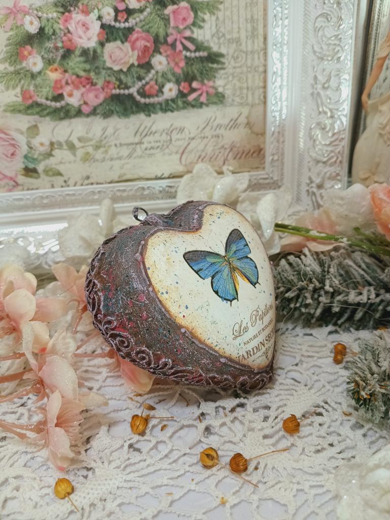 Dekorace srdíčko s motivem zajíčka a modrého motýlka. Okolo hlavního otivu je vytvořena bordura a okolo obvodu srdíčka reliéfní ornamenty. Celé srdíčko má vytvořené reliéfní povrch a je barveno více barvami, poté je patinované.
