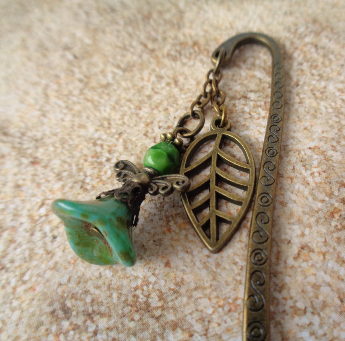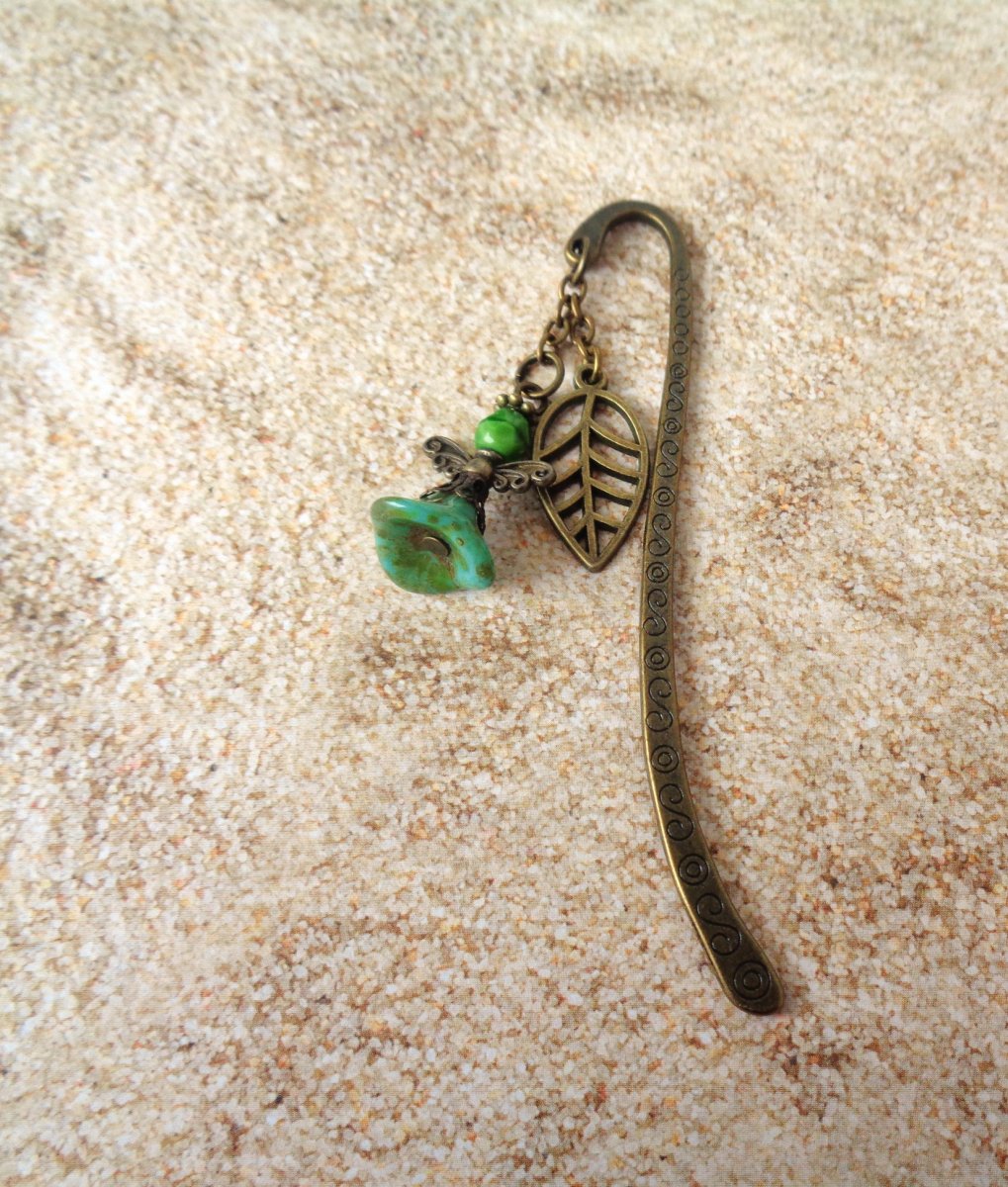Kovová zdobená záložka do knihy v bronzové barvě s andílkem ze skleněných zelenohnědých korálků. Doplněna je lístkem také bronzové barvy