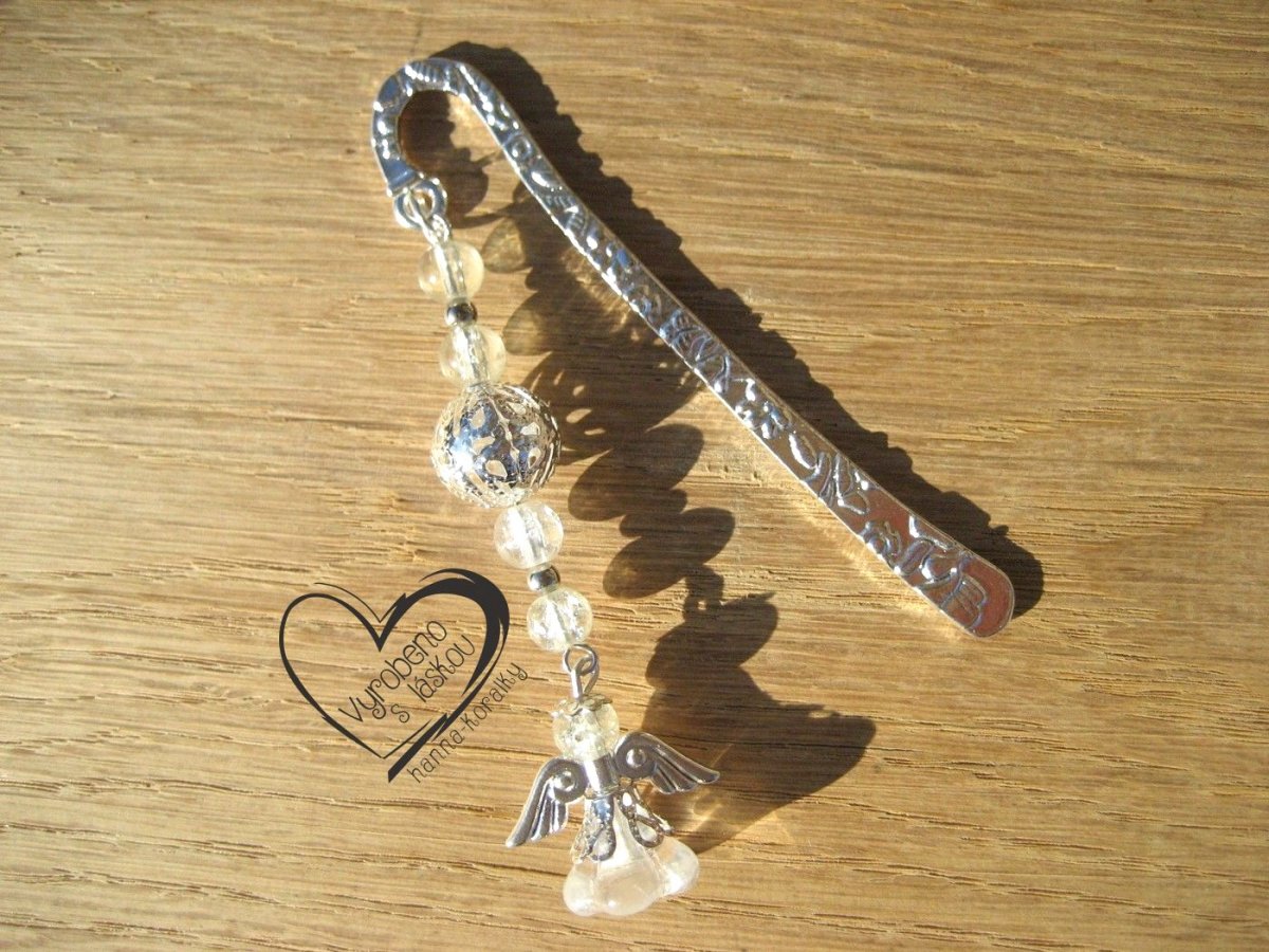 Kovová záložka do knížky, knihy, bloku s s korálky a andílkem pro štěstí ve bílé barvě, krásný dárek pro každého (nejen) náruživého čtenáře a knihomila, délka kovové záložky 8 cm + korálkový závěs.