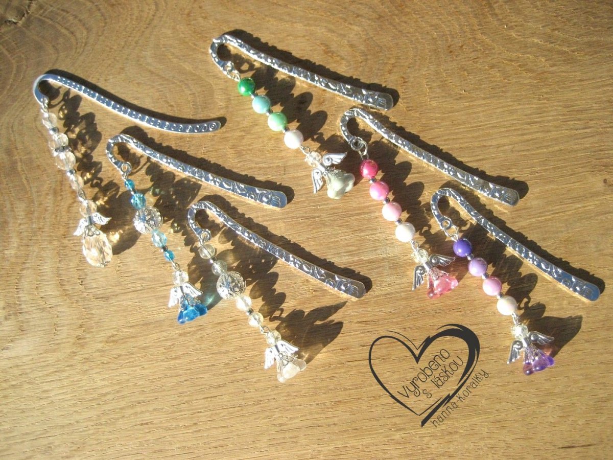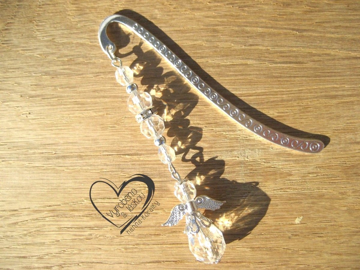 Kovová záložka do knížky, knihy, bloku s s korálky a andílkem pro štěstí ve bílé barvě, krásný dárek pro každého (nejen) náruživého čtenáře a knihomila, délka kovové záložky 8,5 cm + korálkový závěs.