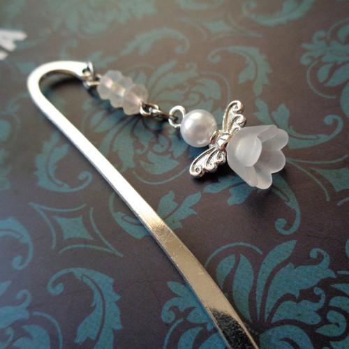 Kovová záložka do knihy ve stříbrné barvě s andílkem, doplněna je skleněnými korálky s duhovým efektem.