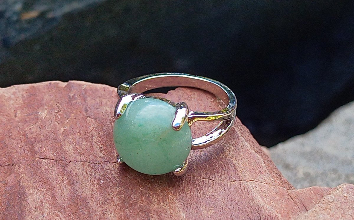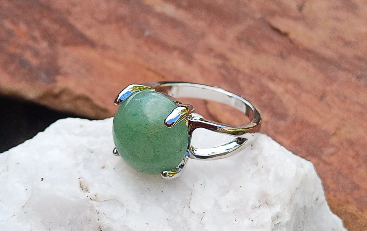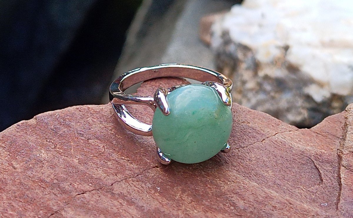 Prstýnek se vsazeným kabošonem zeleného avanturínu o průměru 12 mm v postříbřeném elegantním kroužku.