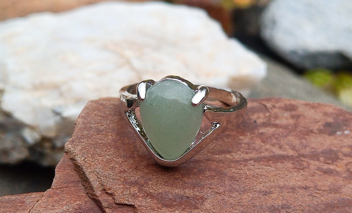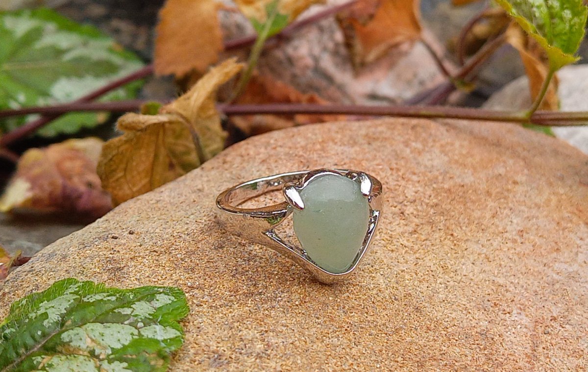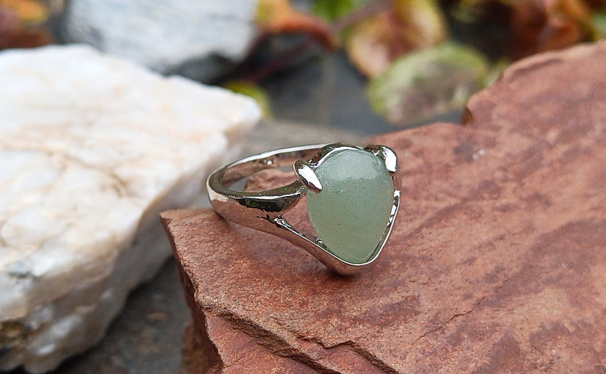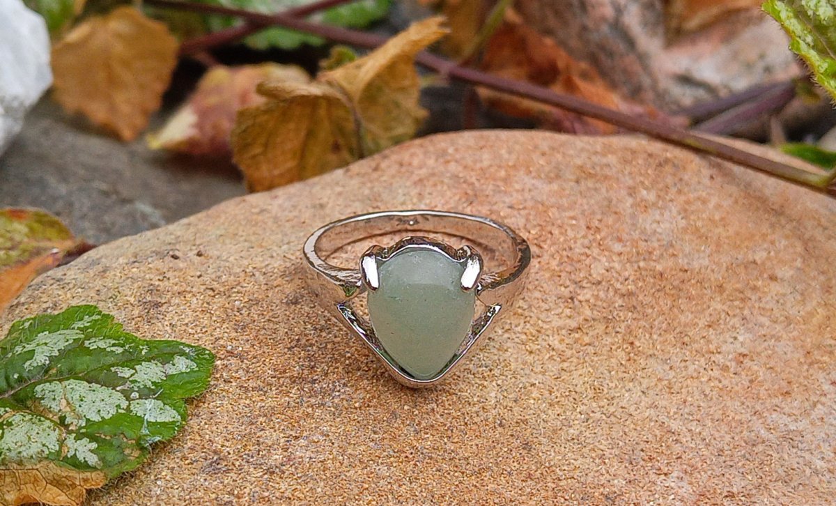 Světle zelený avanturín ve tvaru kapky o velikosti cca 13x10 mm v elegantním postříbřeném prstýnku