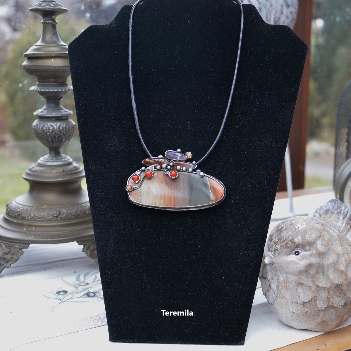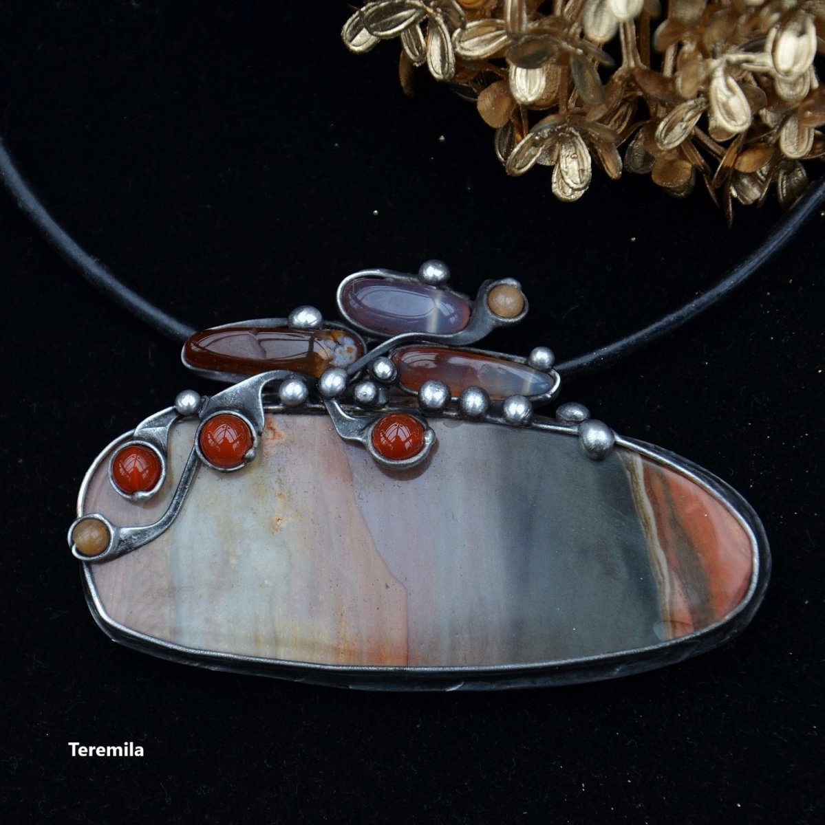 Šperk je vyroben cínováním. Je tvořen jediným obrovským oválným plátkem jaspisu polychrom, který je leštěn z obou stran. Kámen je veliký 8 x 3,5 x 0,8 cm. Barvy kamene jsou unikátní a jedinečné. Béžová se prolíná s různými odstíny hnědé až přejde do šedozeleného odstínu uprostřed, aby se zcela náhle změnila na oranžovo rezavou. barvy jsou příjemné, měkké s plynulými přechody. Jsou jak vrstevnaté části zemské kůry.