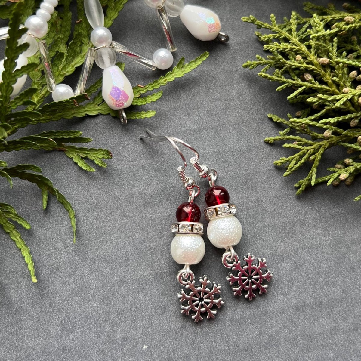 Drobné náušnice se skleněnými a plastovými korálkami, čirou štrasovou rondelkou a stříbrnou vločkou. Délka od háčku 3,3 cm, gumové zarážky. Komponenty v barvě stříbra - běžný kov
