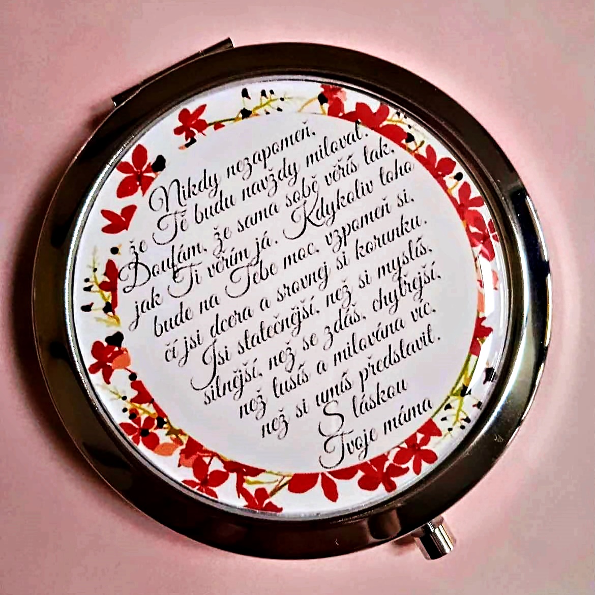 zrcátko - otevírací, průměr 70 mm, průměr motivu 57 mm, obsahuje 2 zrcátka - běžné a zvětšovací (kosmetické), barva platinová