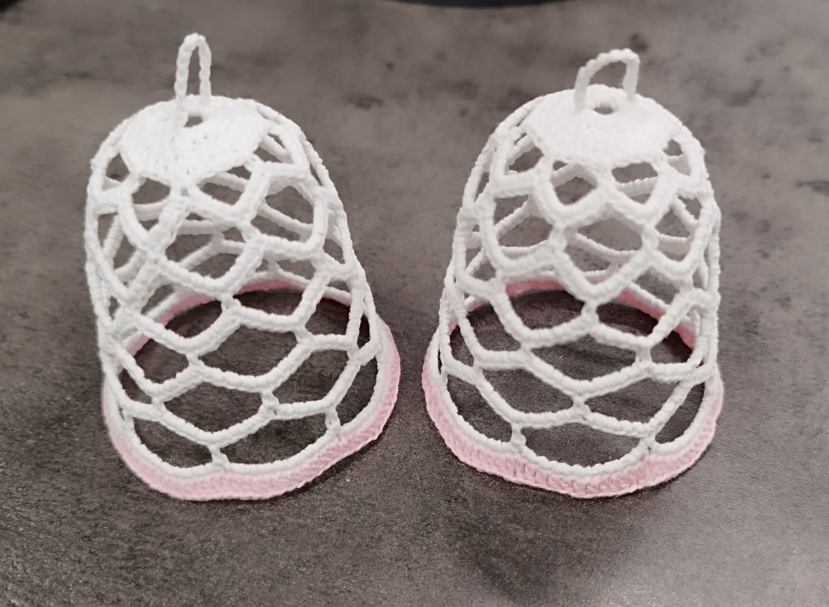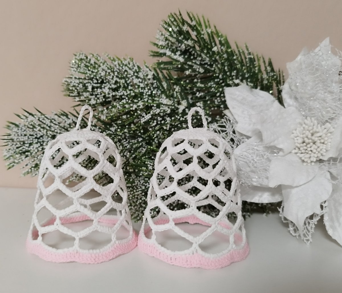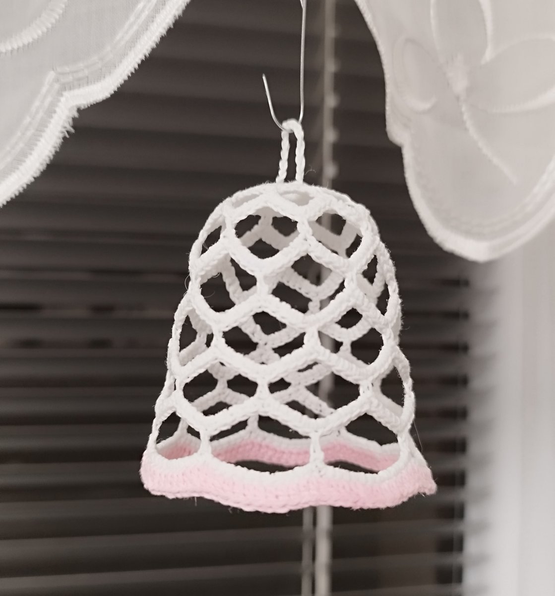 Zvoneček menší velikosti. Uháčkovaný z bílé příze, růžově olemován.