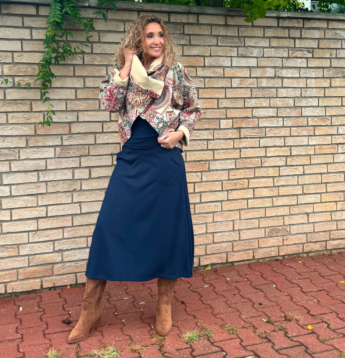 Zvonová sukně je ušitá ze směsového středně silného úpletu (Vis/pes/el). Pásek je pružný (vyztužený proti vytažení). Sukně má klasické vnitřní kapsy.
