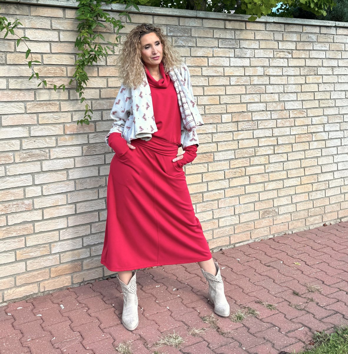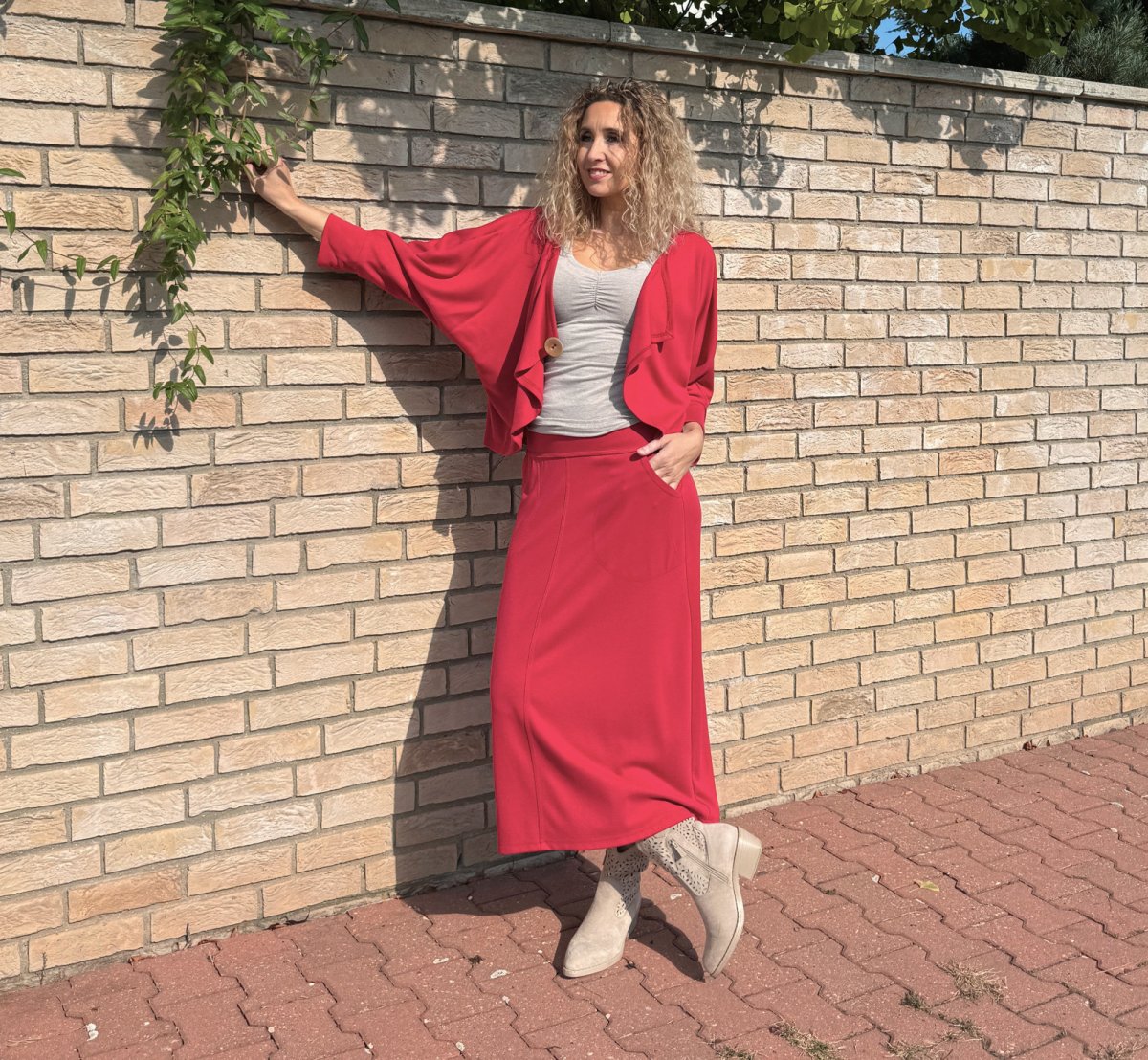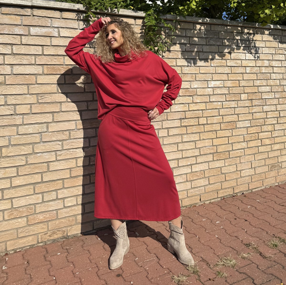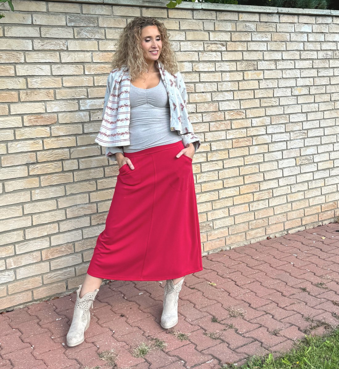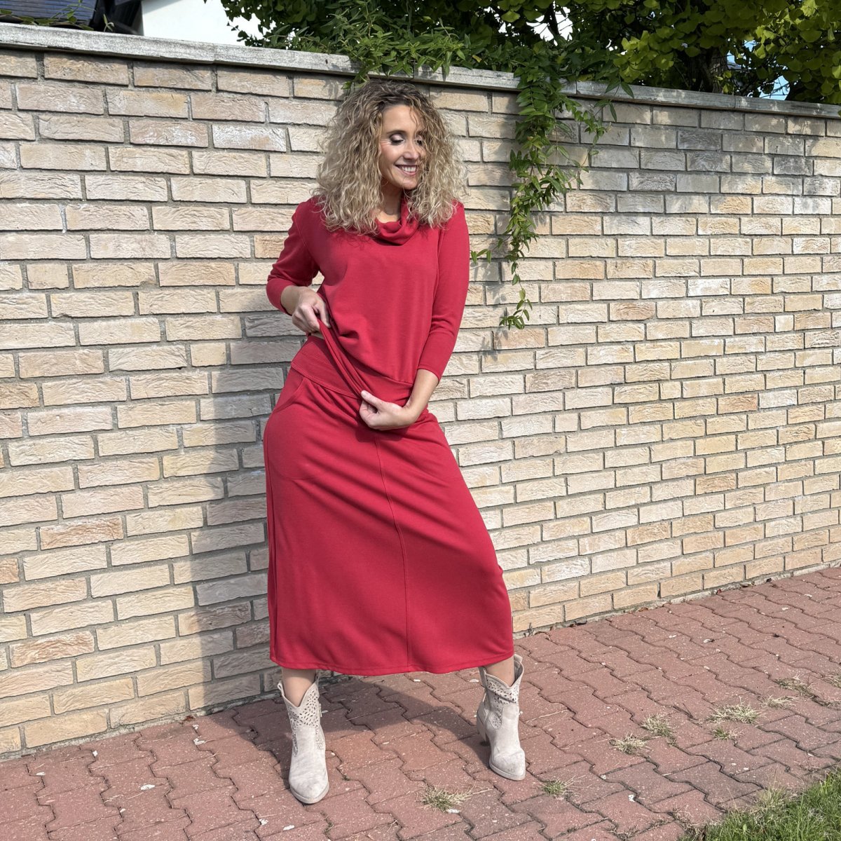Zvonová sukně je ušitá ze směsového středně silného úpletu (Vis/pes/el). Pásek je pružný (vyztužený proti vytažení). Sukně má klasické vnitřní kapsy.