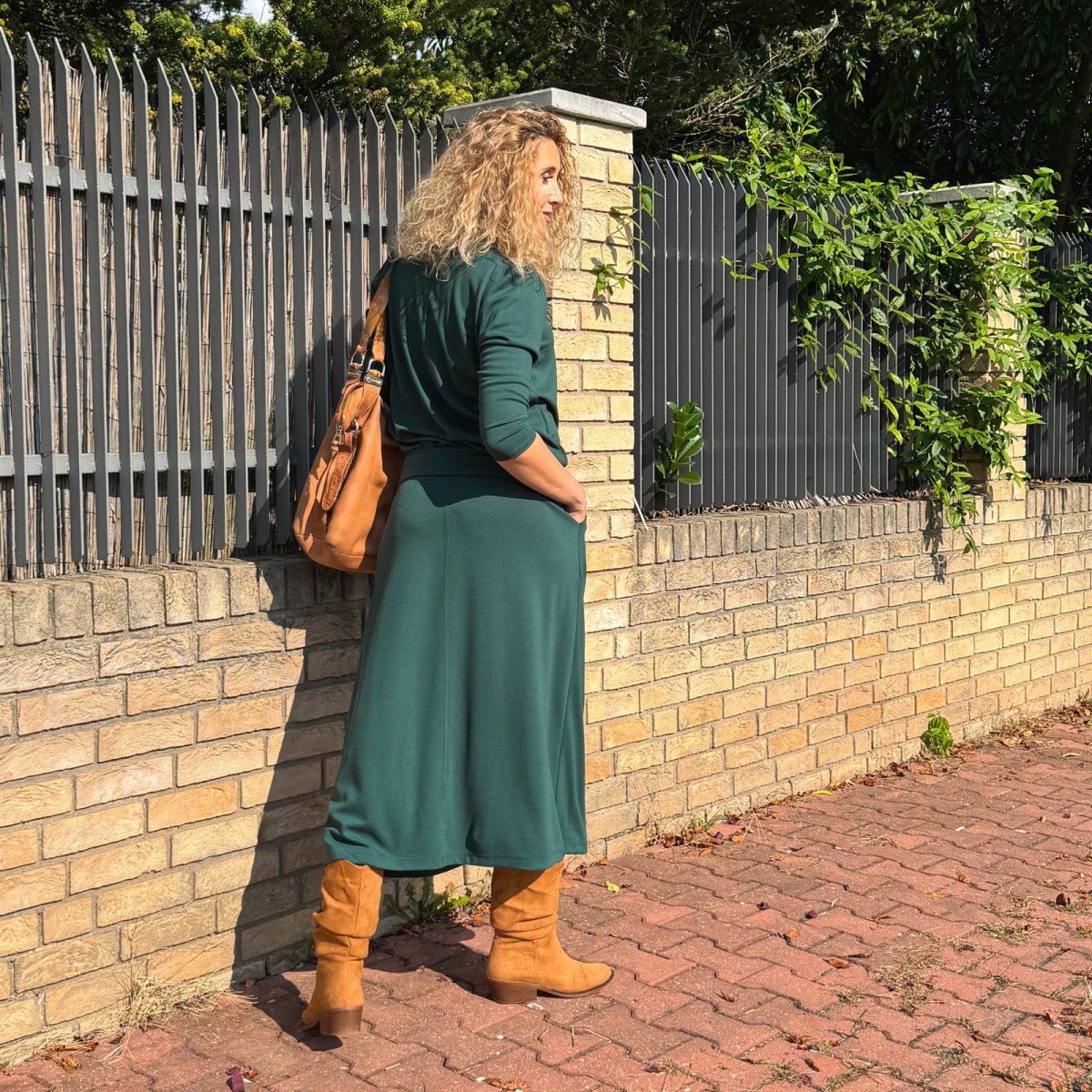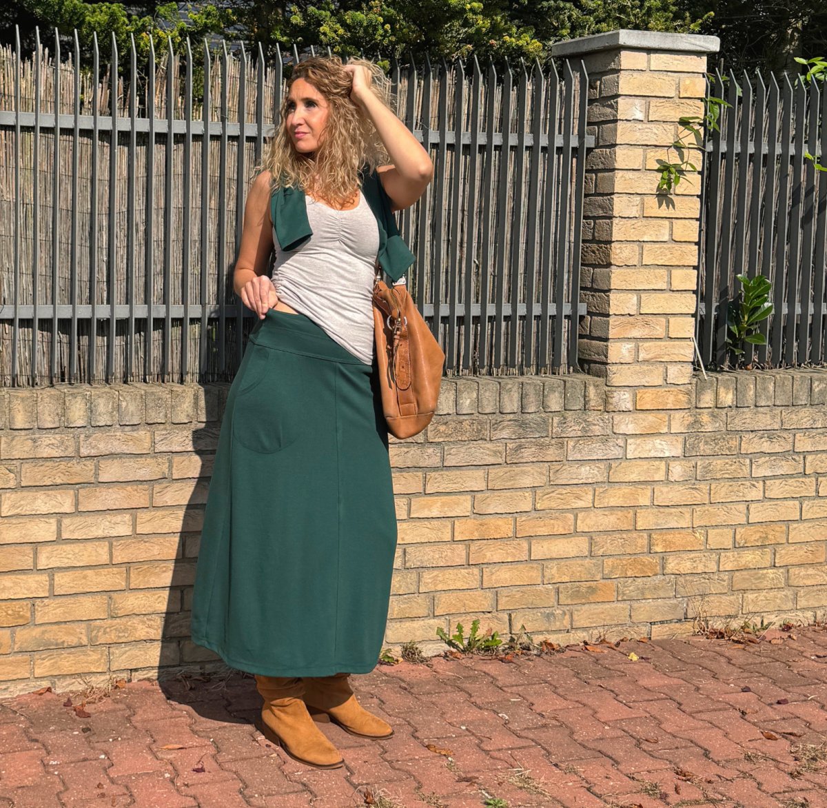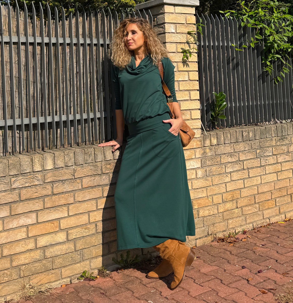 Zvonová sukně je ušitá ze směsového středně silného úpletu (Vis/pes/el). Pásek je pružný (vyztužený proti vytažení). Sukně má klasické vnitřní kapsy.