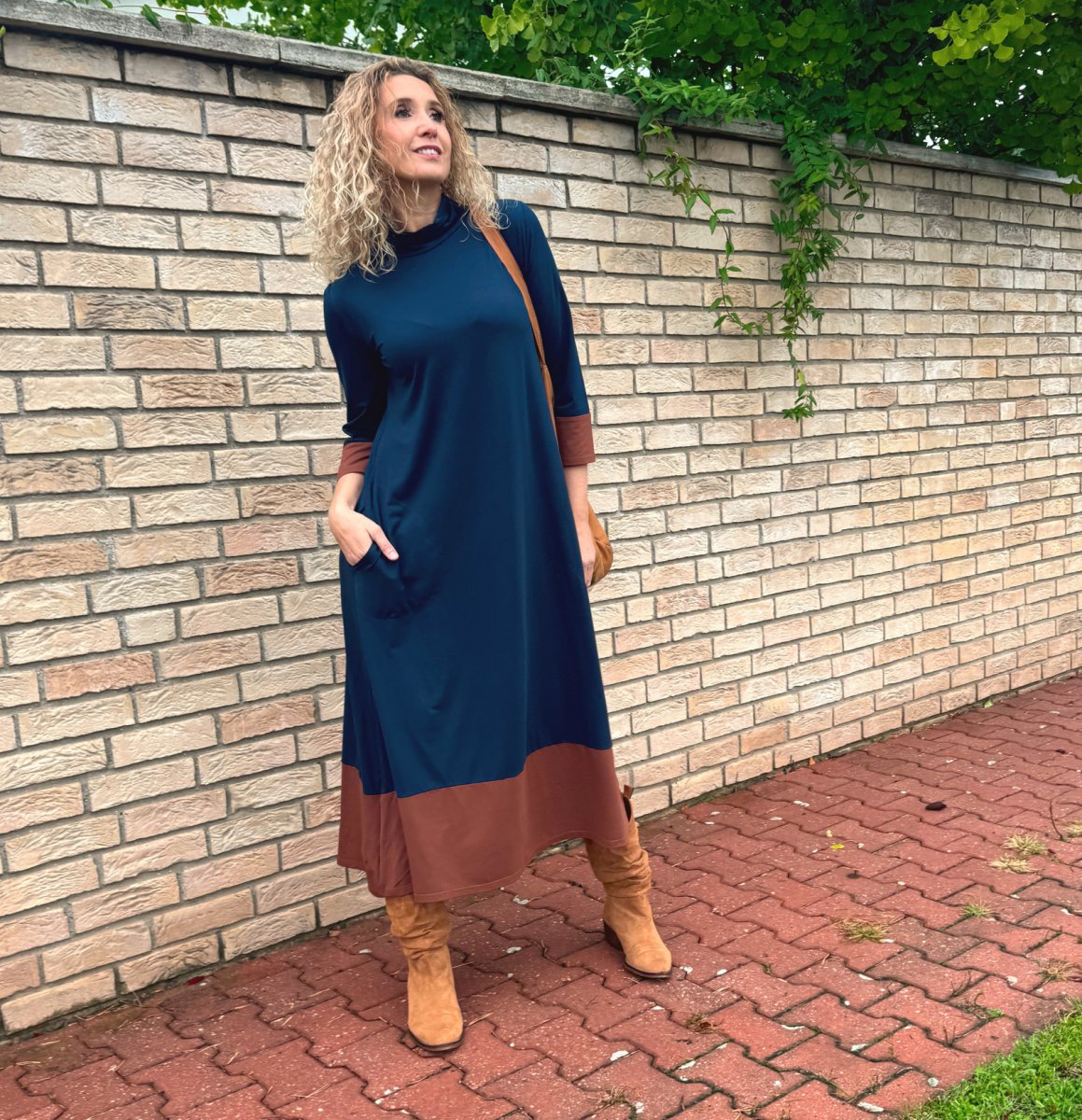 Střih je pohodlný, sukně je rozšířená do zvonu. Šaty mají na zádech ozdobnou slzu. V bočních švech jsou kapsy. Rukáv 3/4 délka