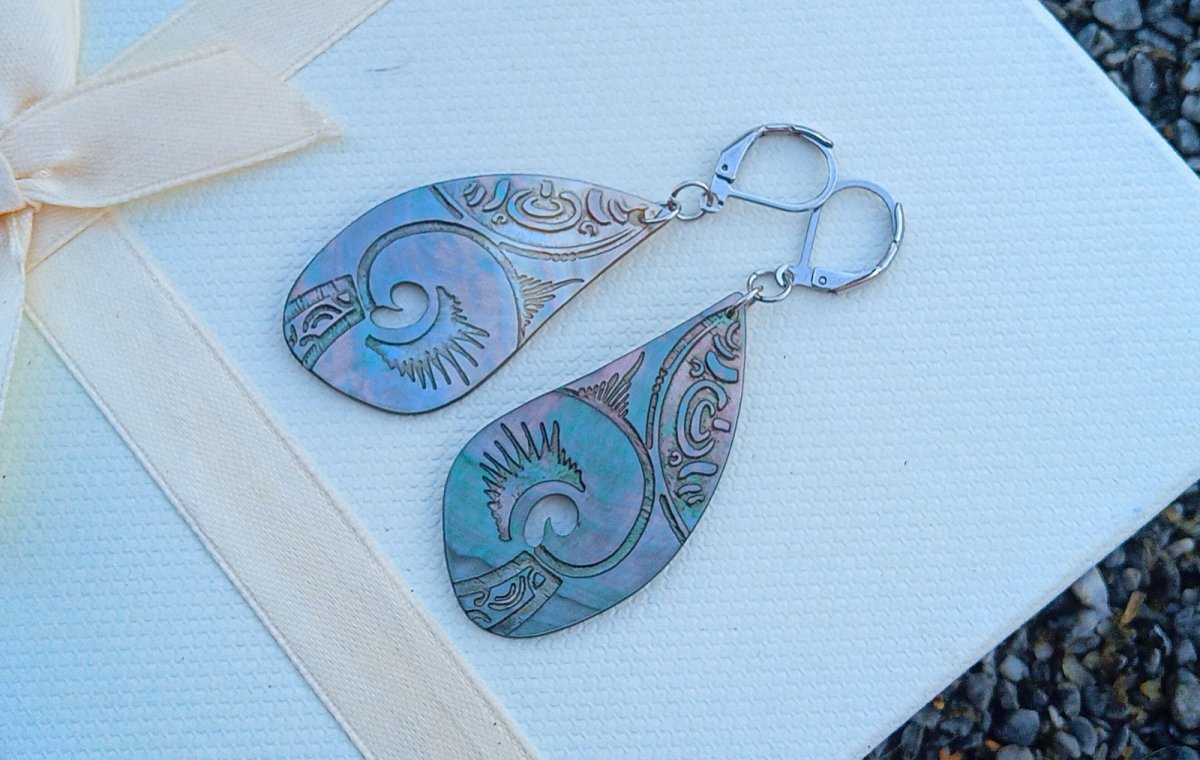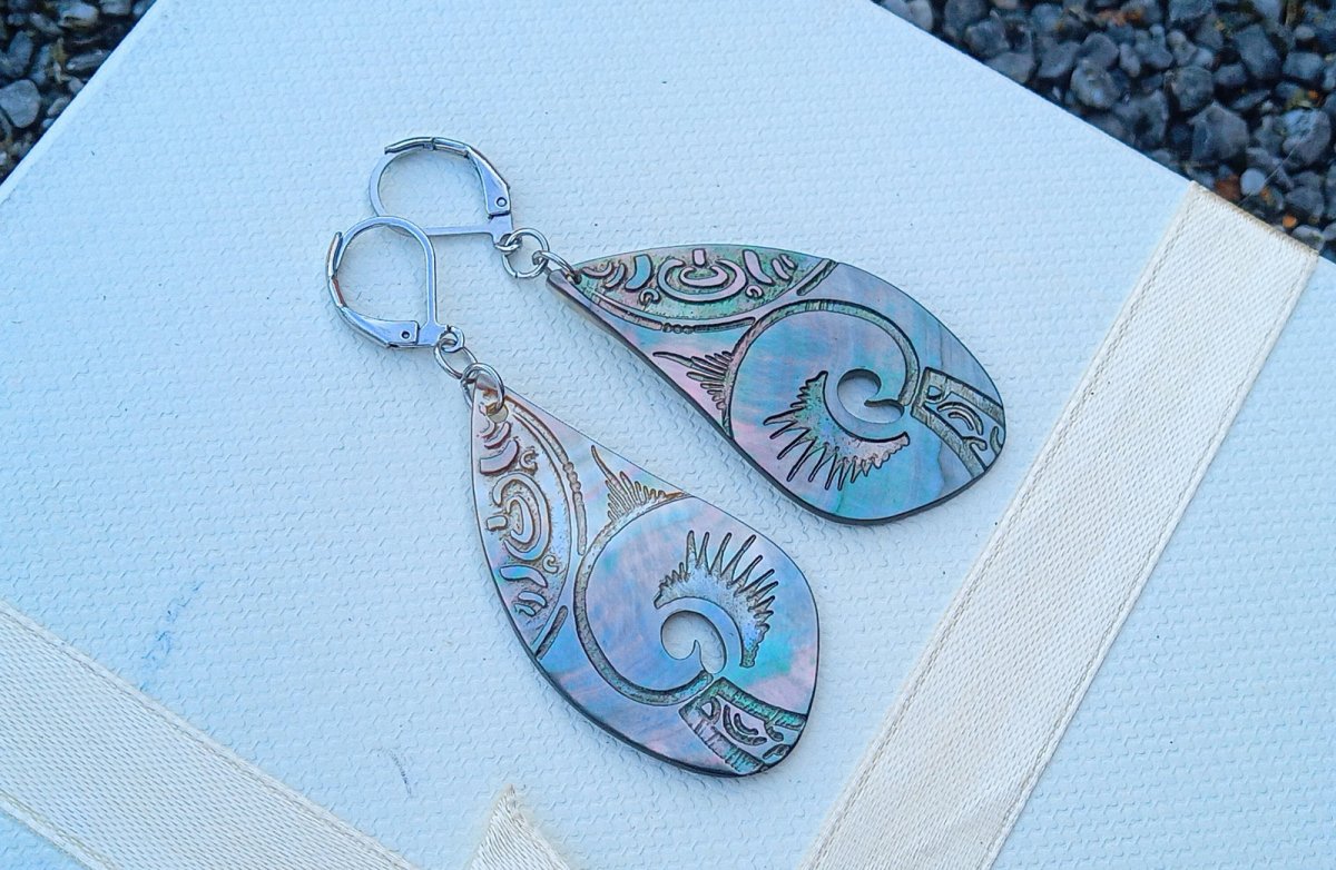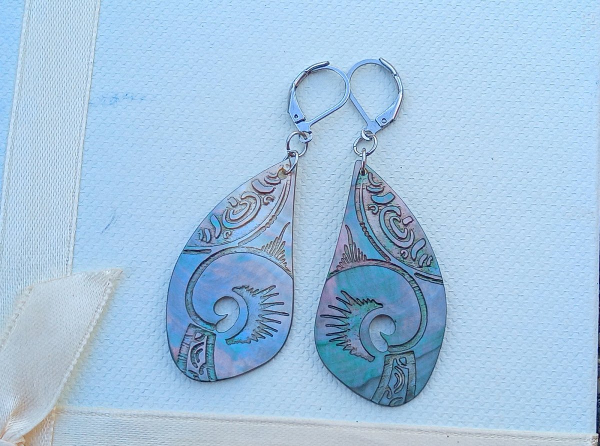 Fantastické opalizující náušnice z Novozélandské perleťoviny, známé jako paua nebo abalone shell vyrobené z velkých plátků perletě ve tvaru kapek cca 45x23 mm s vyřezaným orientálním vzorem na zavíracích háčcích z chirurgické oceli - hypoalergenní, vhodné i pro alergiky.