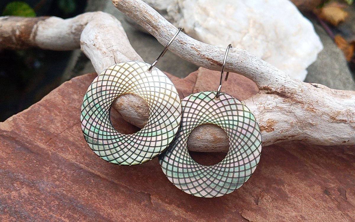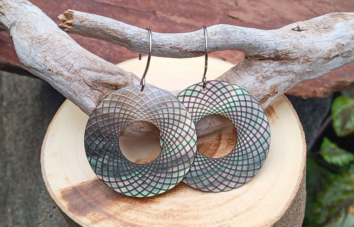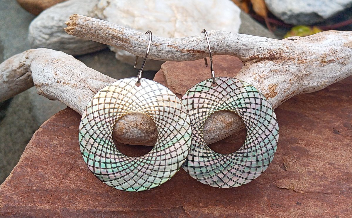 Fantasticky duhové náušnice z Novozélandské perleťoviny, známé jako paua nebo abalone shell ve tvaru kruhů o průměru 3,5 cm s vyřezaným vzorem, kdy ještě více vyniknou perleťově duhové odlesky na půlkruhových háčcích z chirurgické oceli - hypoalergenní, vhodné i pro alergiky.