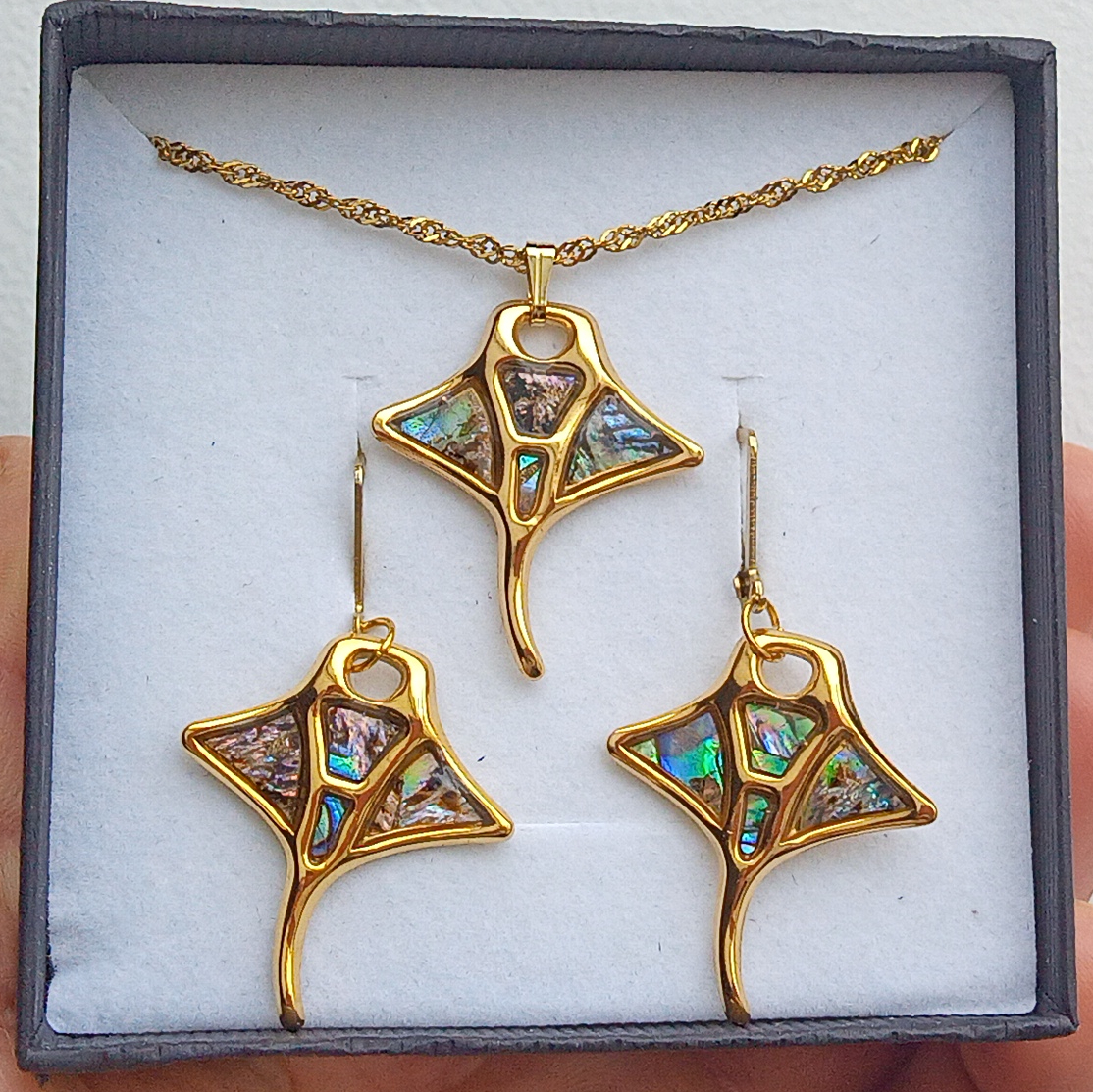 Fantastické opalizující náušnice z Novozélandské perleťoviny, známé jako paua nebo abalone shell ve tvaru pozlacené vážky velké cca 30x26 mm na zavíracích háčcích z pozlacené chirurgické oceli - hypoalergenní, vhodné i pro alergiky.