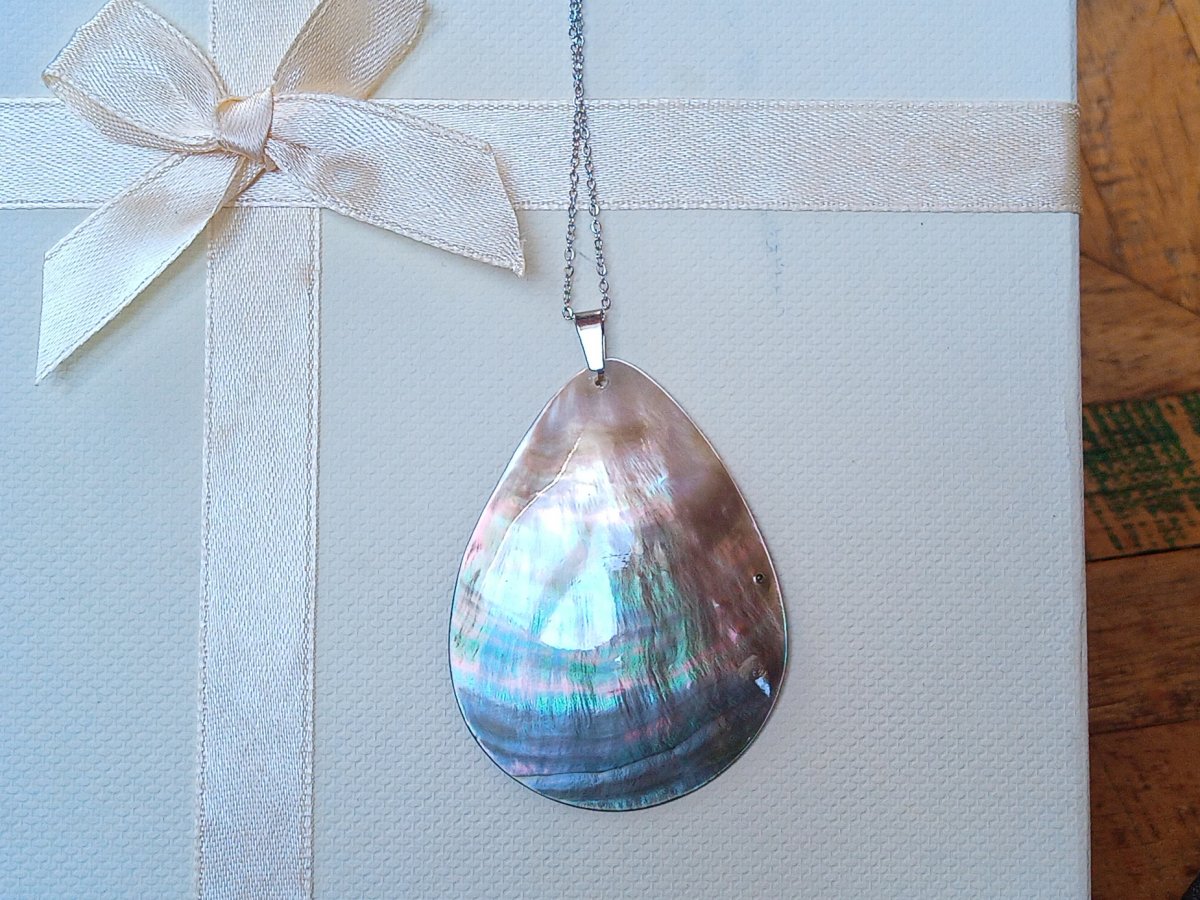 Nepřehlédnutelný fantasticky opalizující přívěsek z novozélandské perleťoviny abalone paua mušle ve tvaru slzy velké 55x43 mm, zavěšený na jemném řetízku z chirurgické oceli o délce 50 cm. V případě zájmu mohu přidělat prodlužovací řetízek. Chirurgická ocel je hypoalergenní kov, vhodný i pro alergiky!