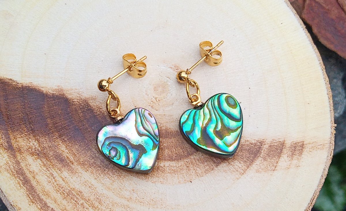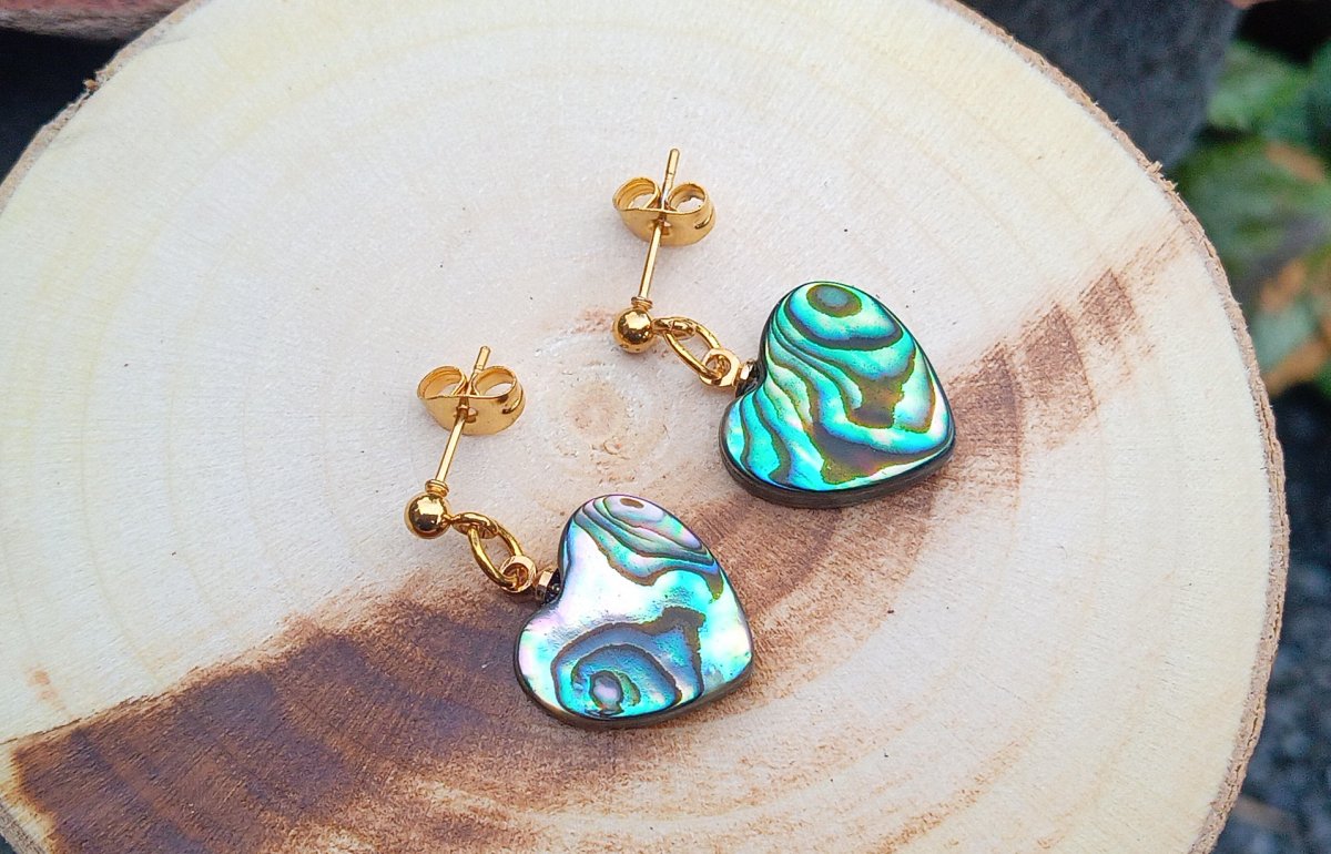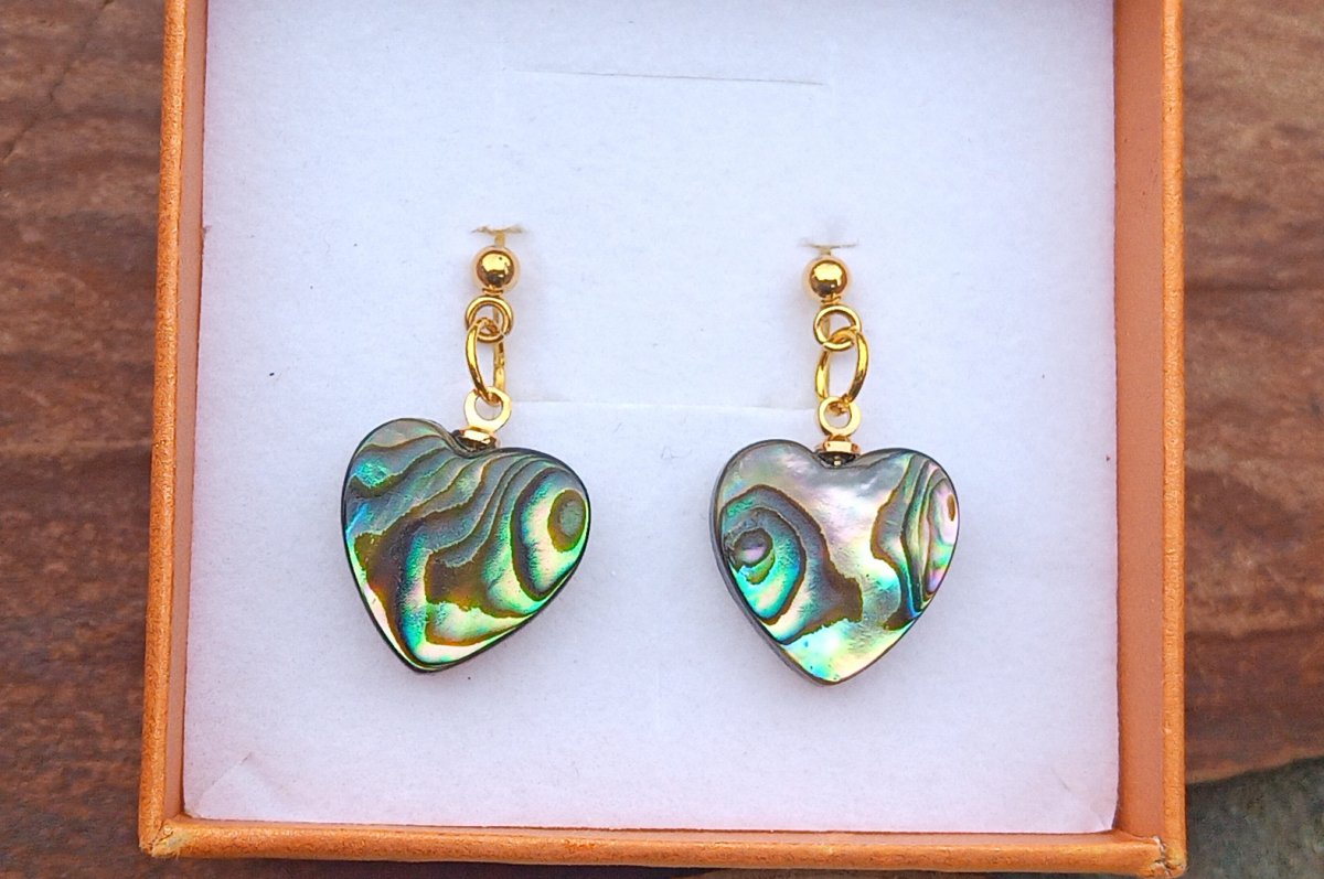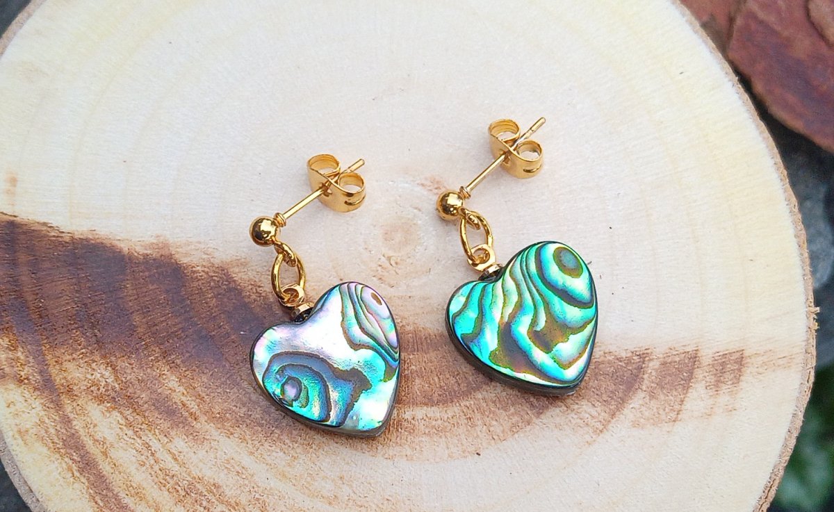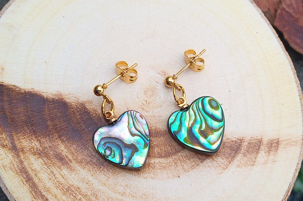 Fantastické opalizující náušnice z Novozélandské perleťoviny, známé jako paua nebo abalone shell ve tvaru srdíček zavěšených pod kuličkami se zapínáním jako puzety v pozlacených náušnicích z chirurgické oceli - vhodné i pro alergiky.